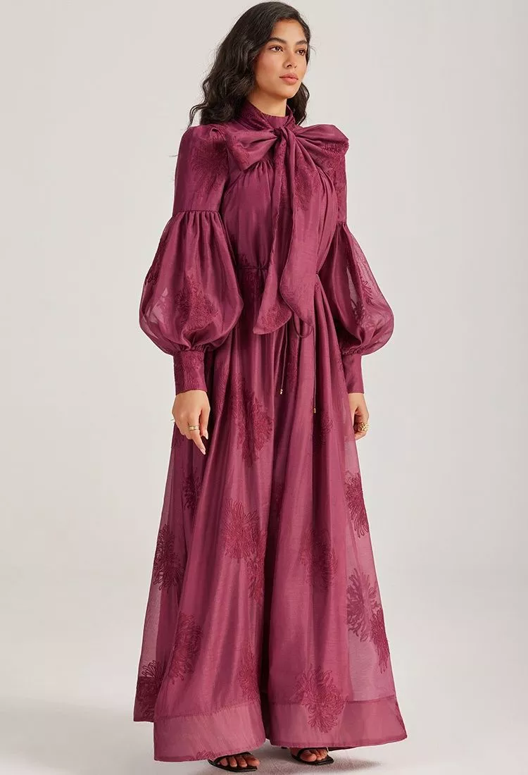 Abito lungo dallo stile raffinato con maxi fiocco frontale e maniche ampie a sbuffo che donano un volume scenografico e romantico.