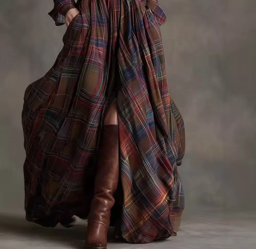 Vestito lungo da donna a quadri diventato virale per il suo stile boho chic e lo spacco frontale che dona movimento e carattere al look. La linea fluida e scenografica lo rende perfetto per outfit d’impatto, ideali per la stagione e per chi ama distinguersi con un capo protagonista.
