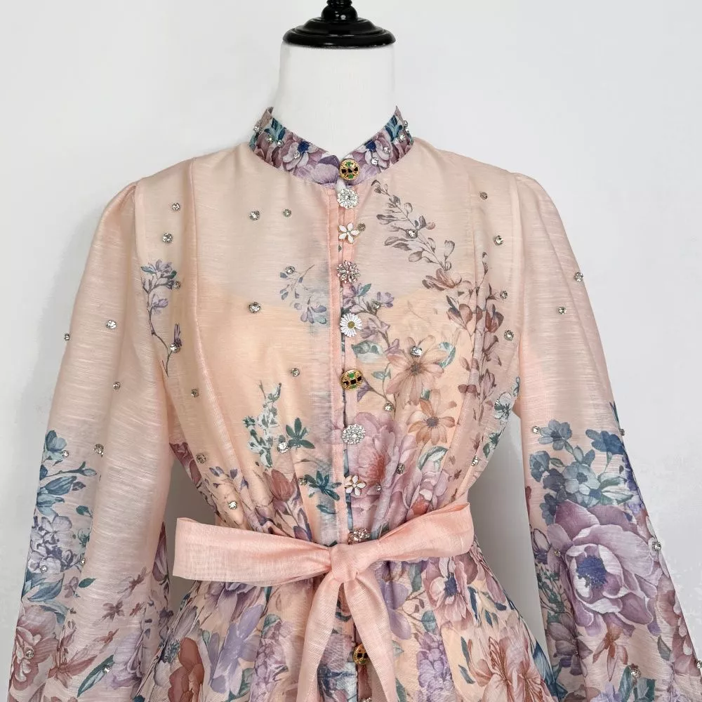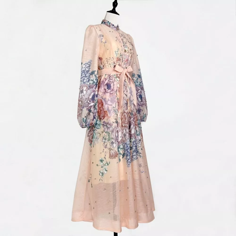 Vestito Lungo Rosa Cipria Floreale Con Maniche Lunghe E Cintura In Vita CF63386