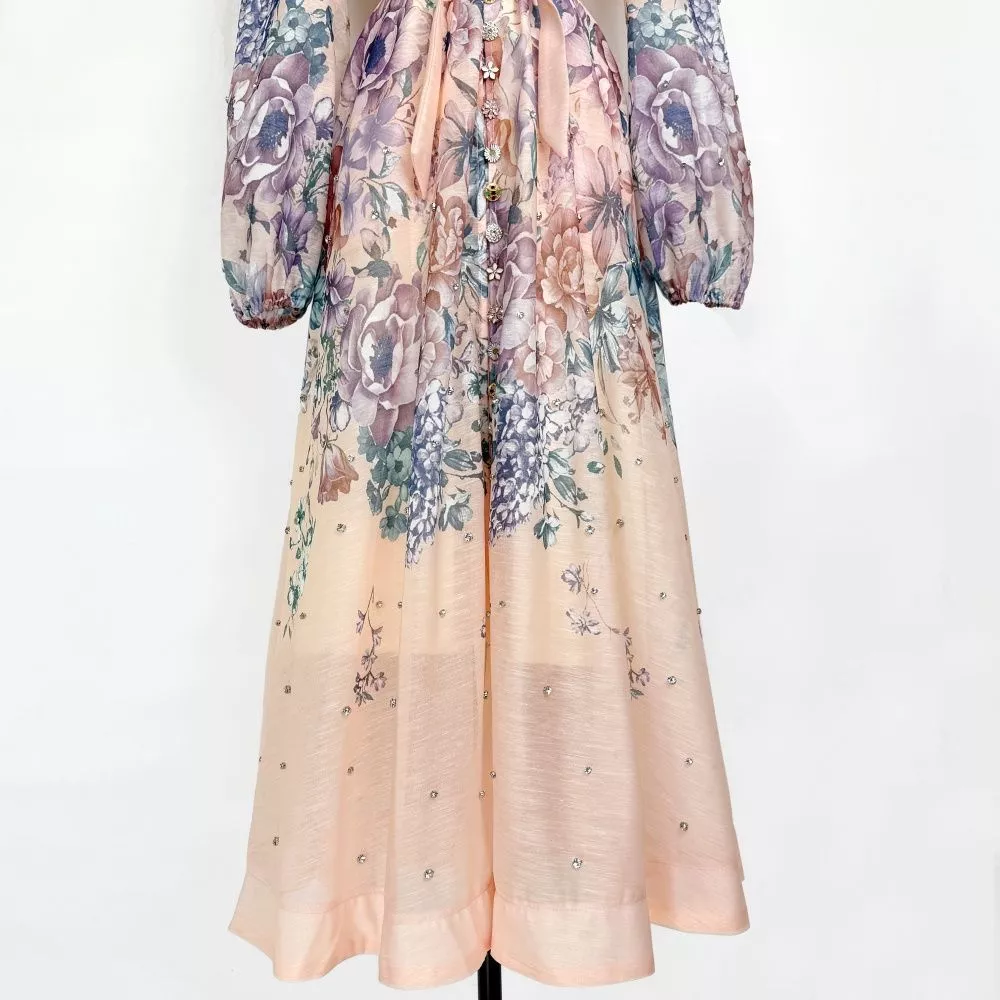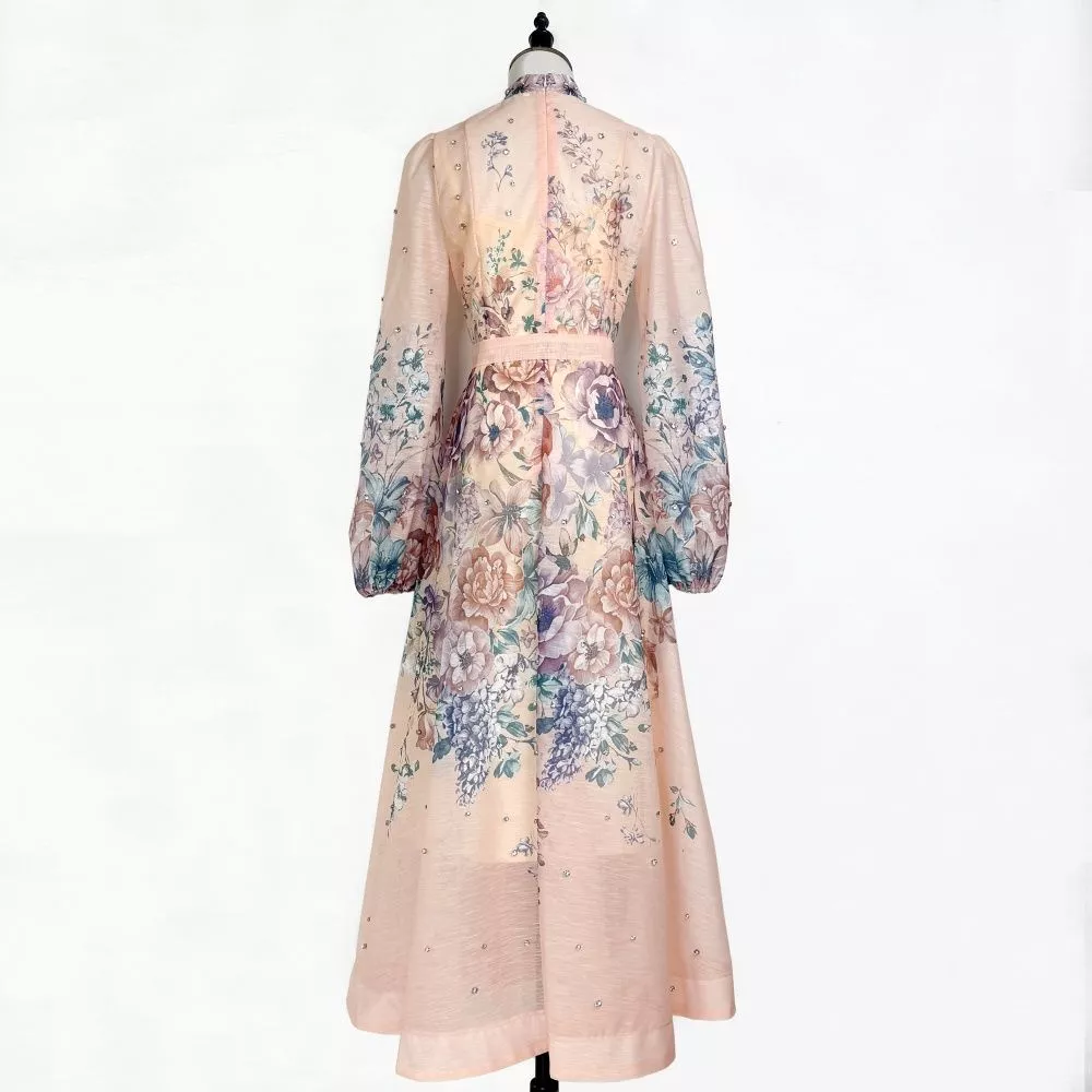 Le maniche lunghe leggermente morbide donano equilibrio al design, rendendo il capo ideale per cerimonie diurne, eventi raffinati e occasioni speciali. Un modello femminile e ricercato, pensato per chi desidera un abito lungo floreale dall'eleganza senza tempo.