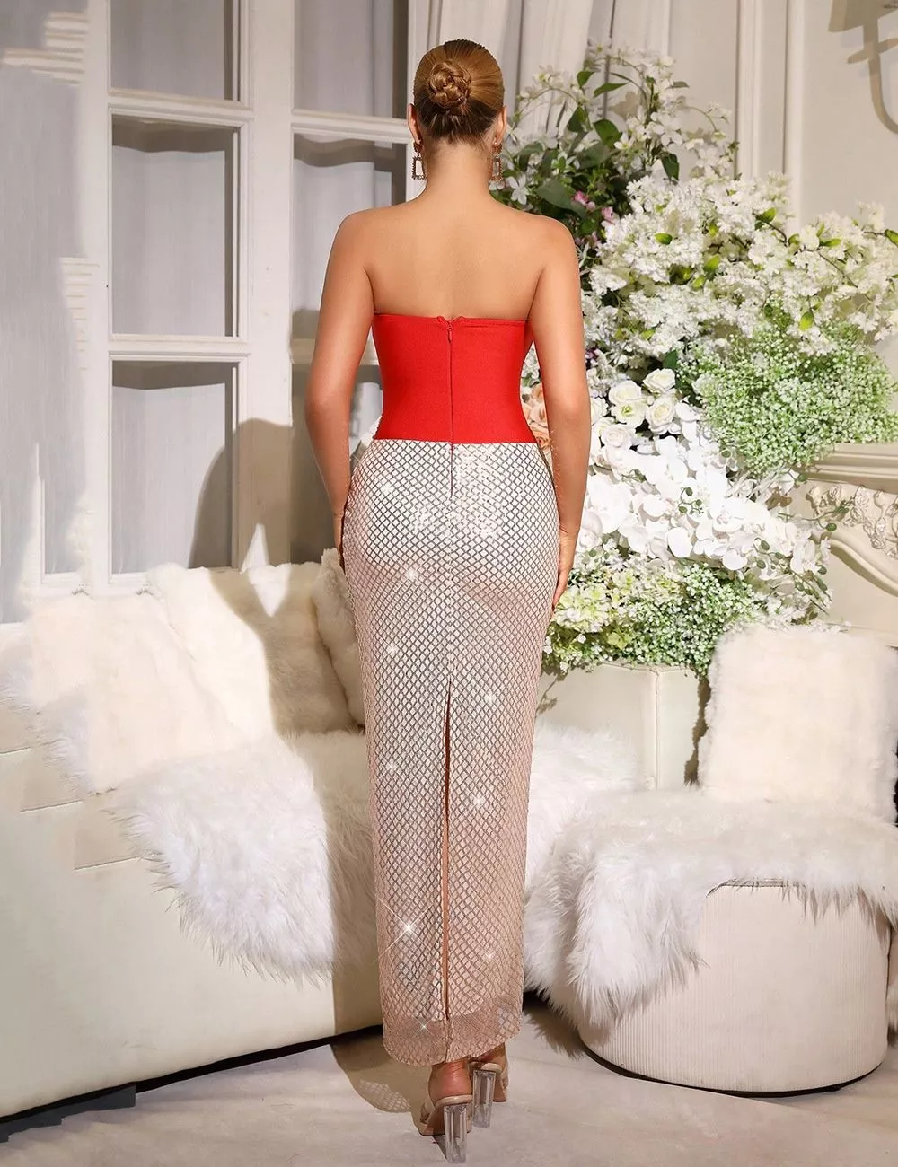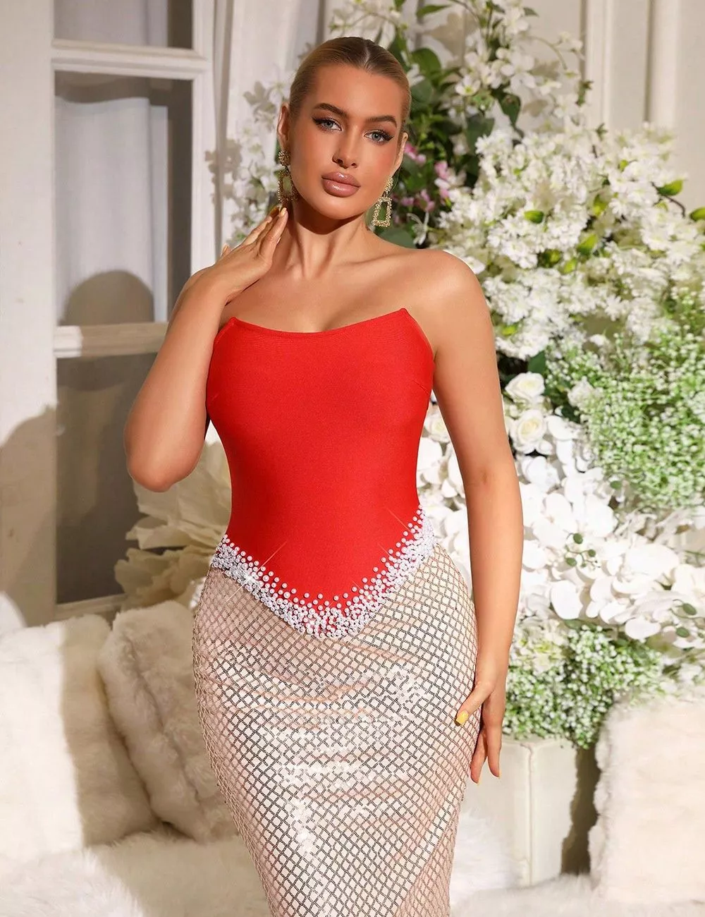Vestito lungo rosso dal design scenografico con corpetto aderente senza spalline e vita a V impreziosita da applicazioni luminose. La gonna in rete glitter effetto cristallo crea un contrasto sofisticato che valorizza la figura con un effetto slanciato e femminile.