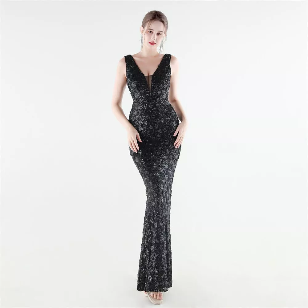 Vestito Lungo Sera Elegante Ricamato Aderente Sexy Profondo Scollo Nero CF61195