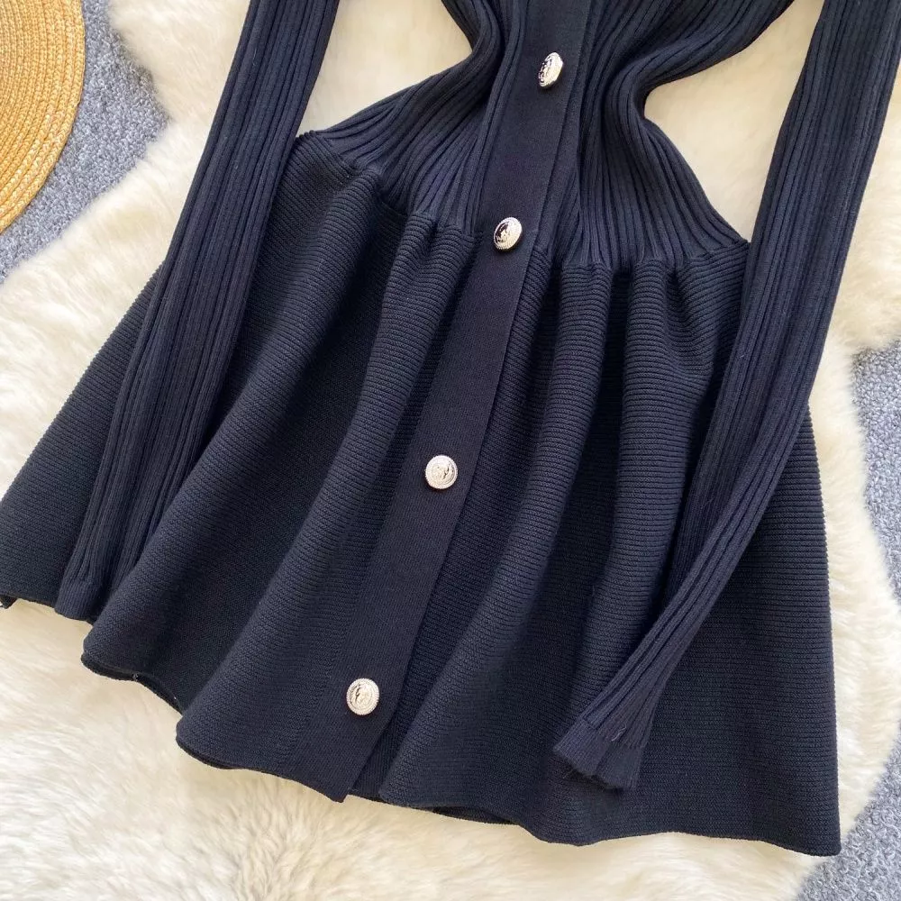 Vestito Maglione Nero Scollo A V Bottoni Elegante Vita Aderente Donna CF60502