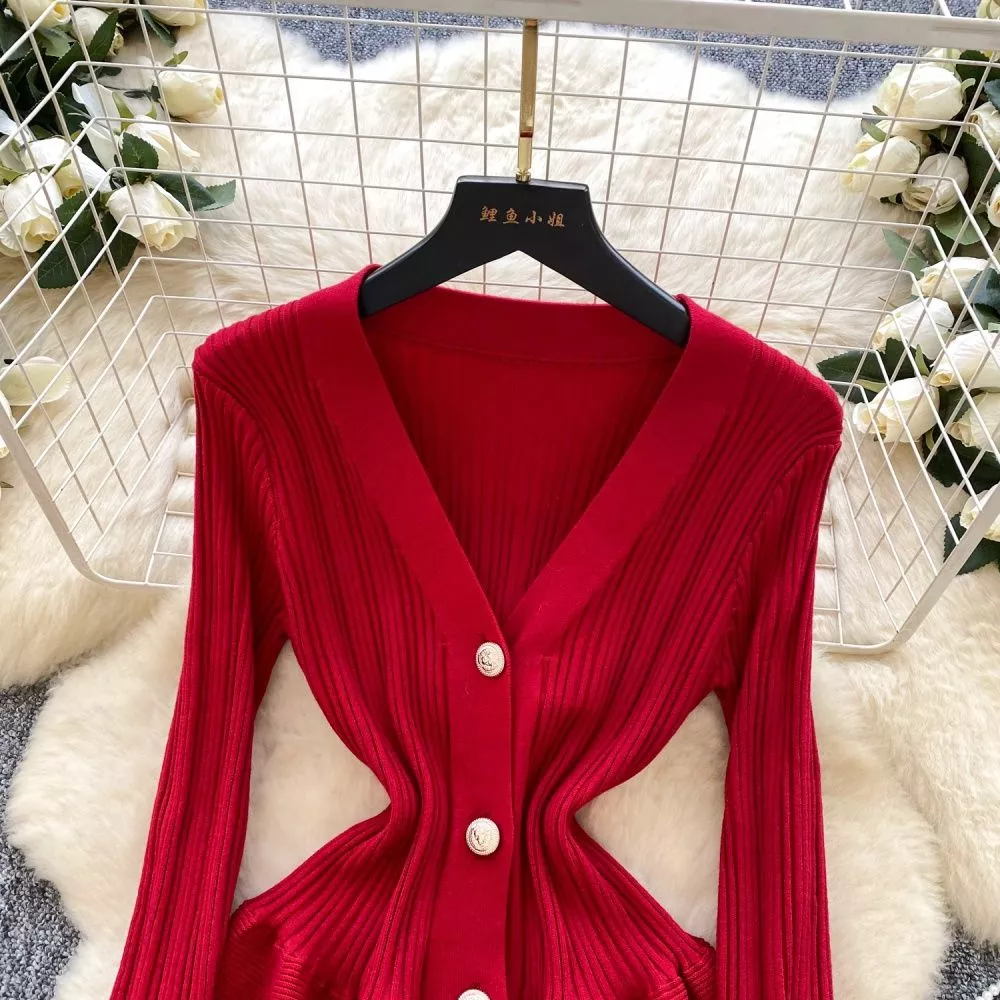 Vestito Maglione Rosso Aderente Con Bottoni Scollo A V Stile Femminile CF60502