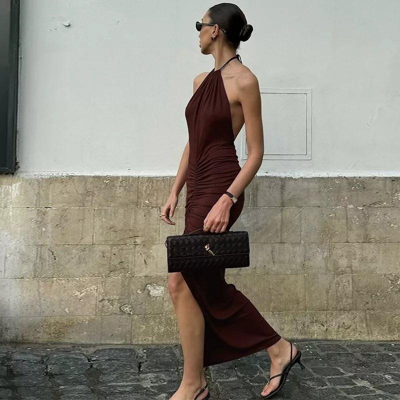 Vestito Marrone Lungo Elegante Donna Con Spacco Sexy Schiena Nuda CF54419