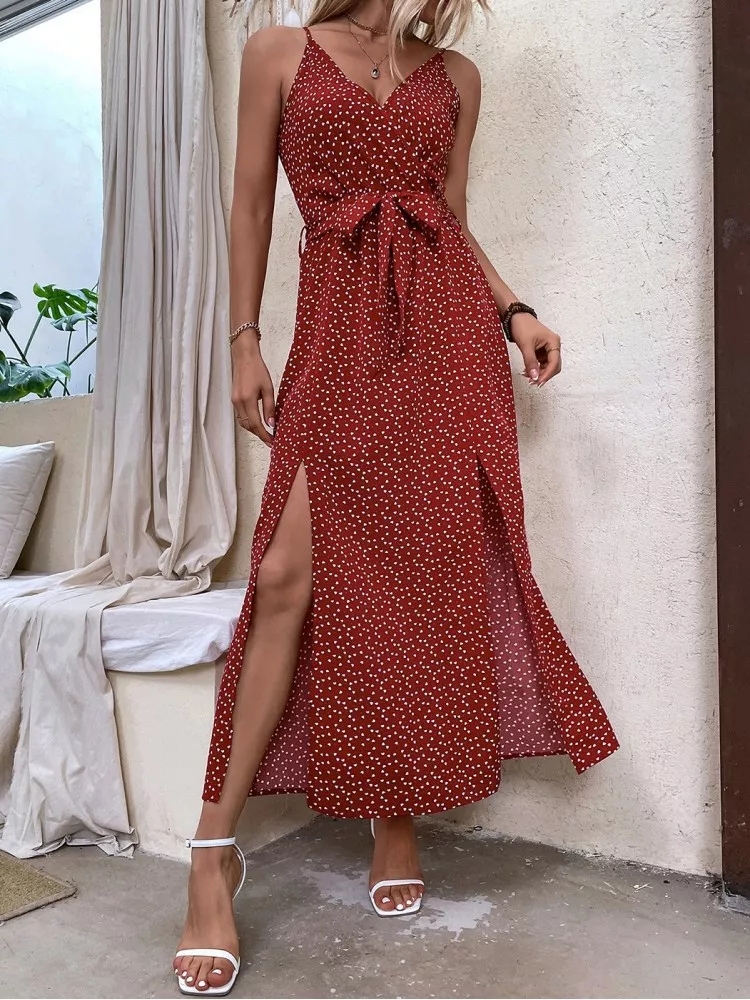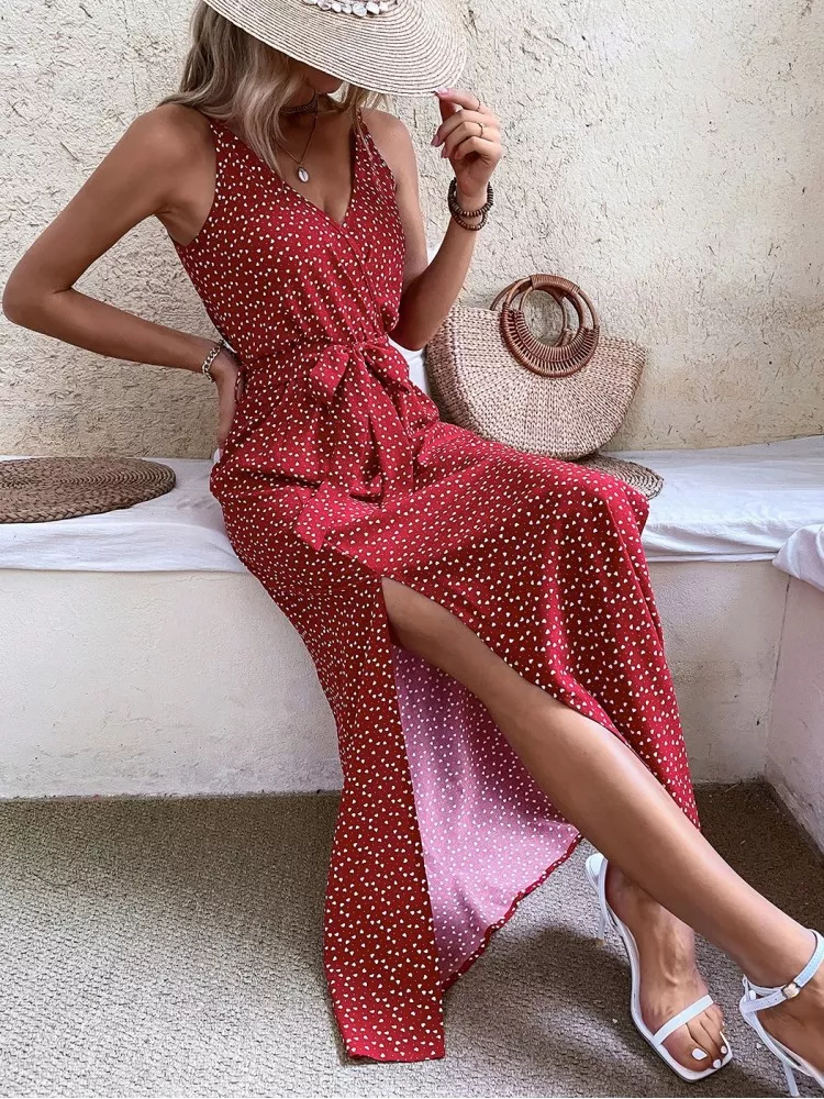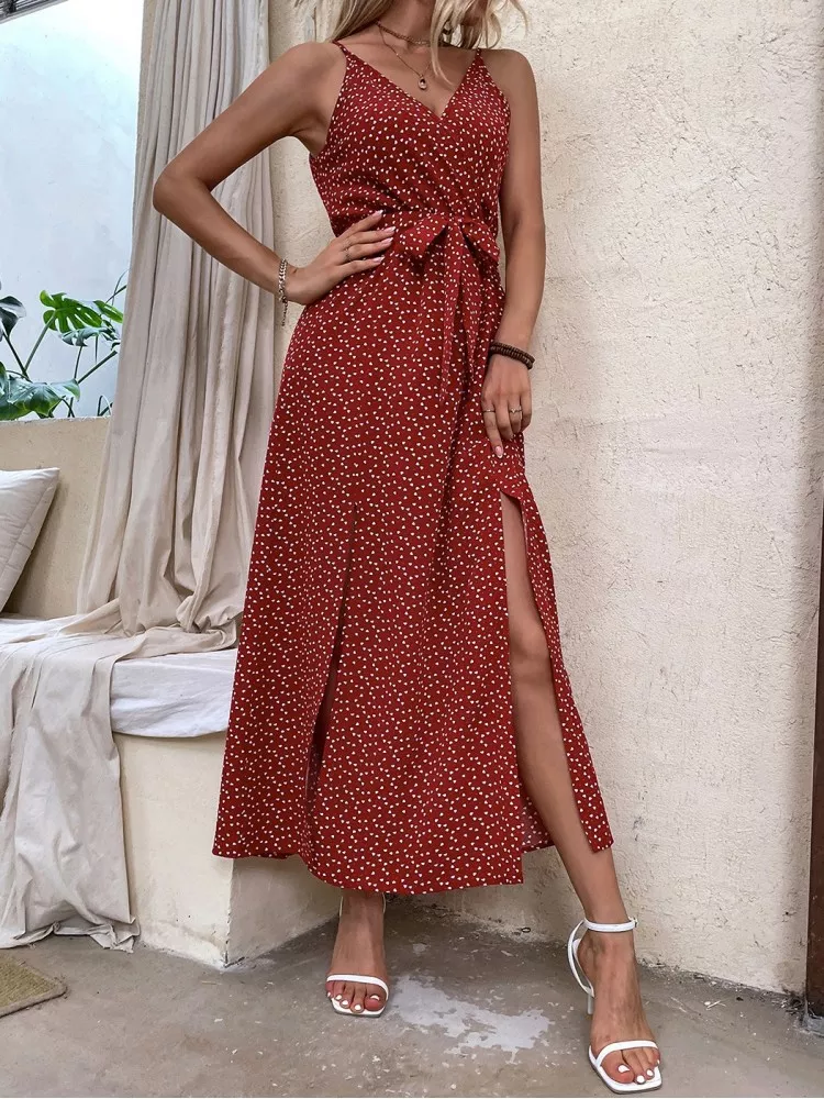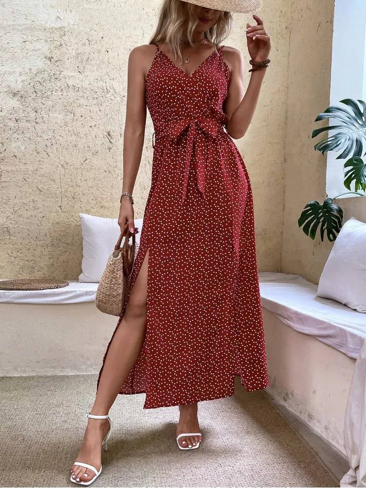 vestito maxi abito donna elegante lungo rosso pois bohemian Boho chic 71378