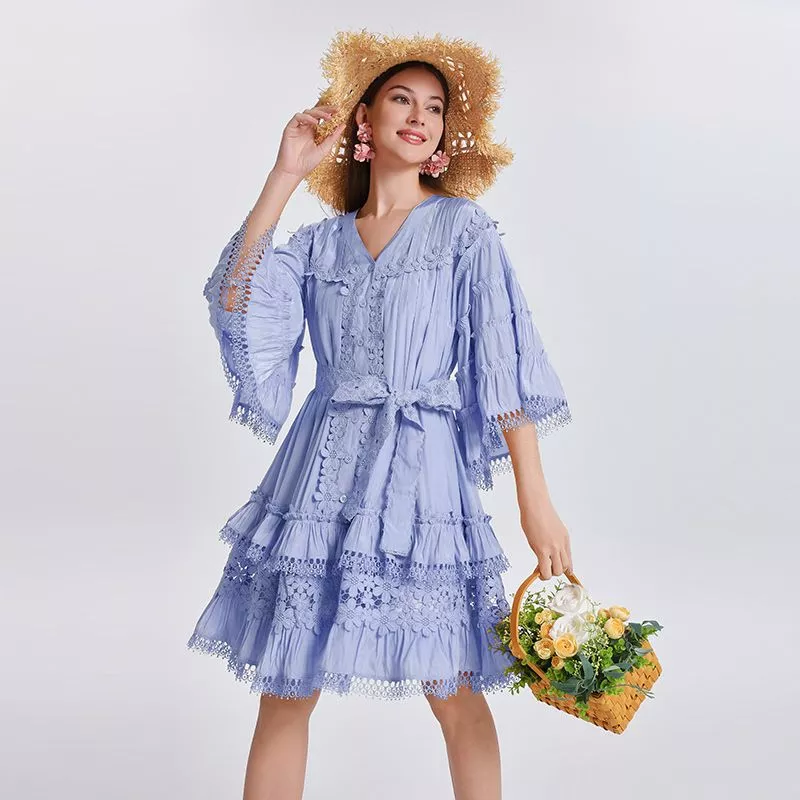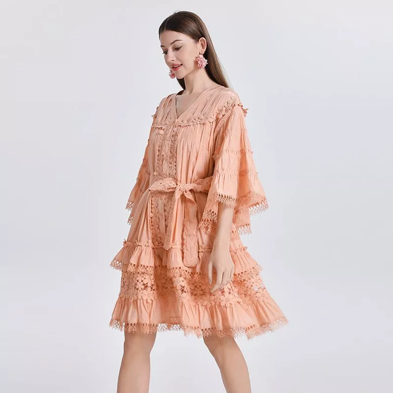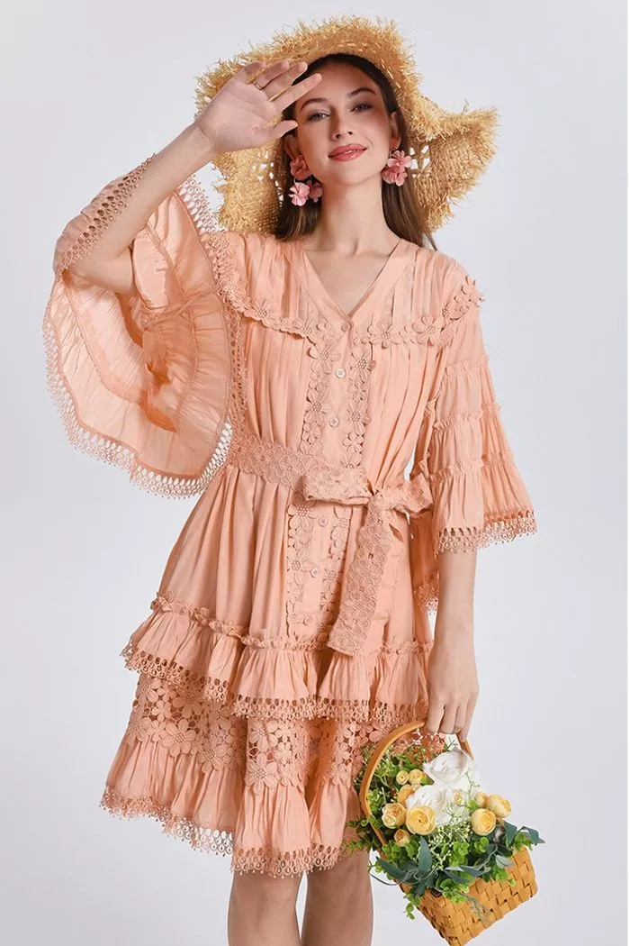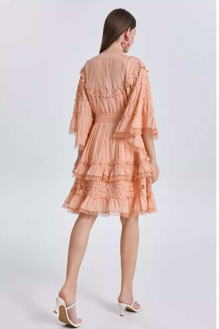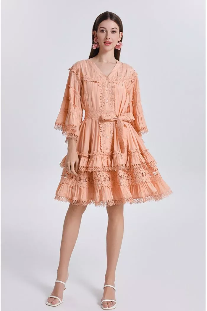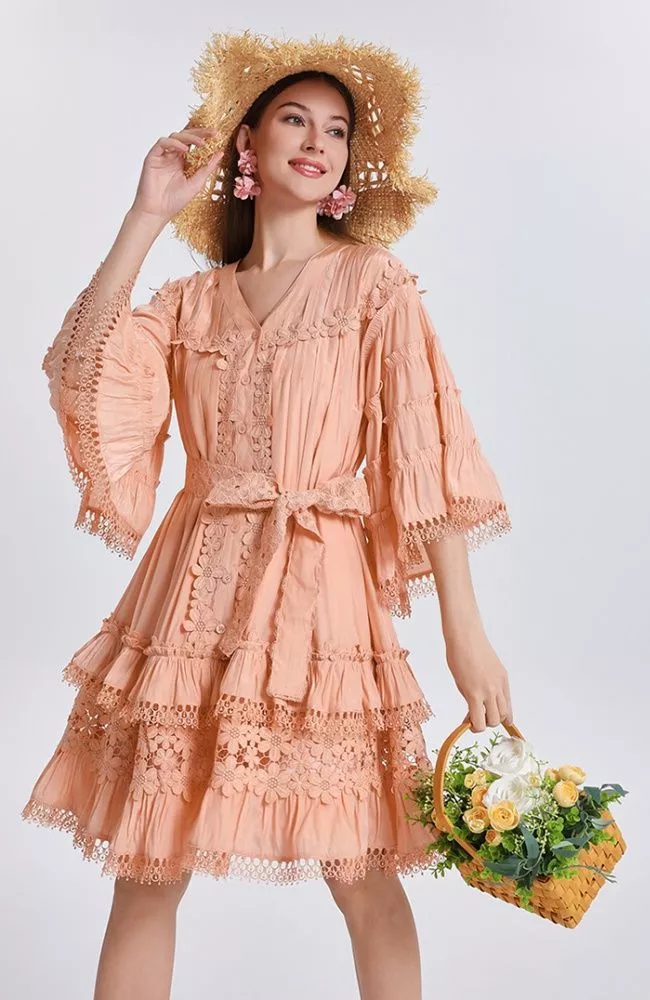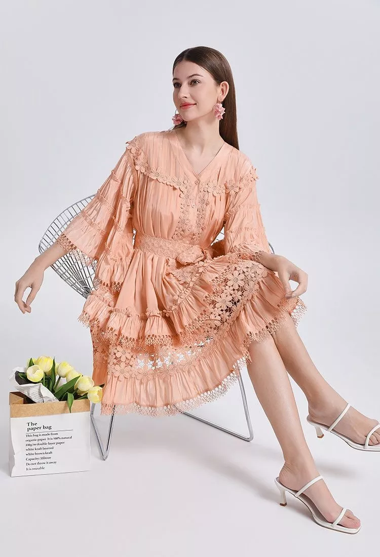 Un vestito che esprime eleganza e fascino romantico: questo abito midi con scollo a V presenta maniche a campana ampie e inserti in pizzo floreale che donano leggerezza e movimento. La cintura in vita sottolinea la silhouette, mentre i dettagli sartoriali lo rendono perfetto per cerimonie diurne, eventi eleganti e occasioni speciali. Disponibile in arancio-rosa, azzurro e verde fluo, è il capo ideale per chi cerca uno stile raffinato con un tocco boho-chic.