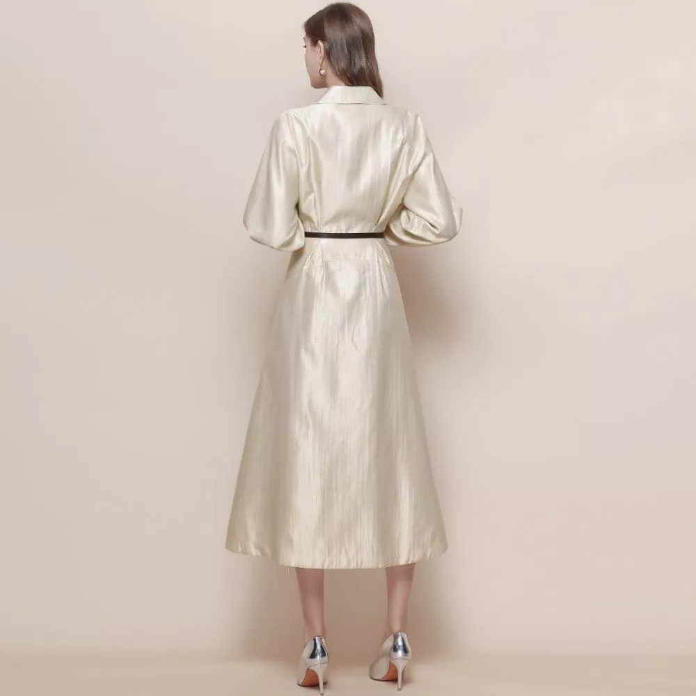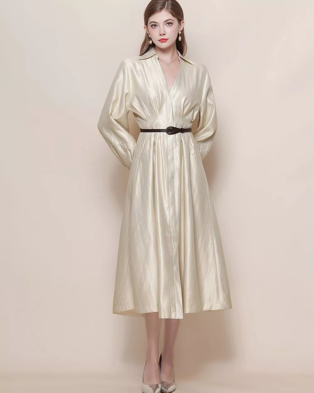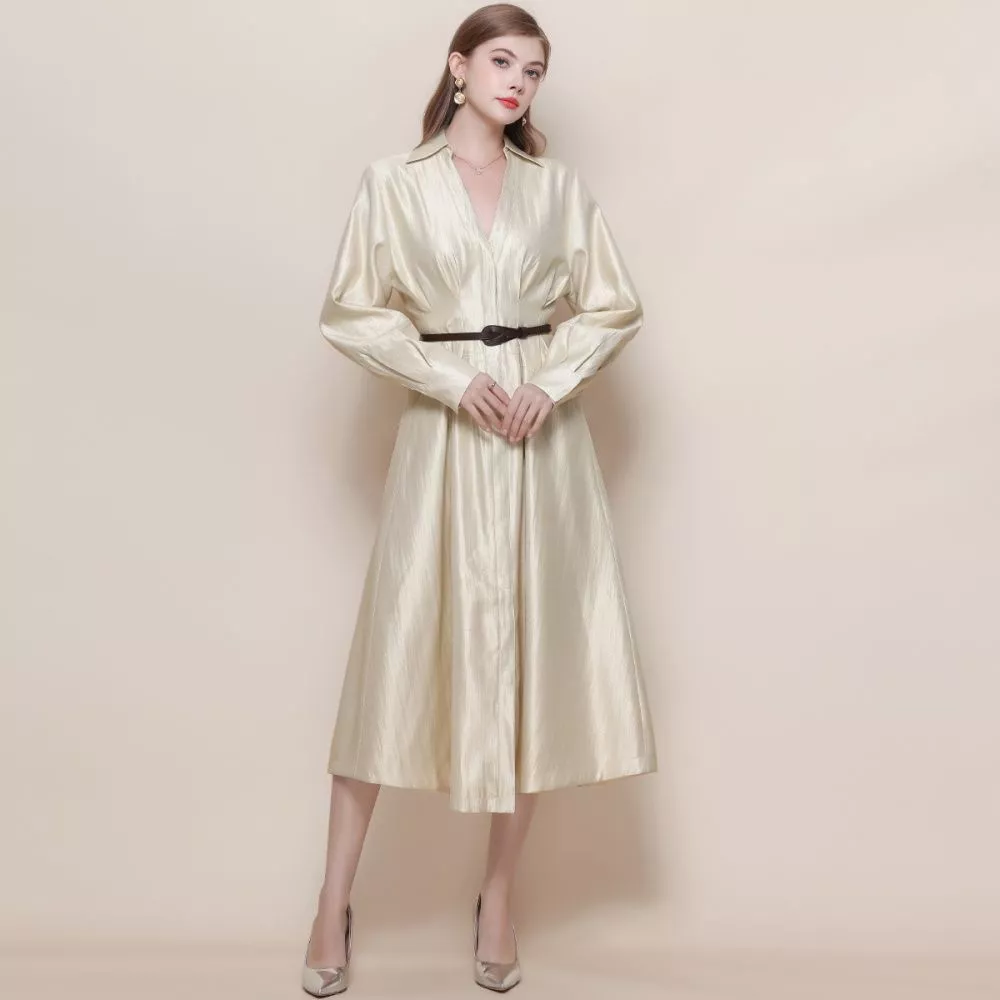 Vestito Midi Champagne Elegante Scollo A V Stile Francese Con Cintura – CF59522