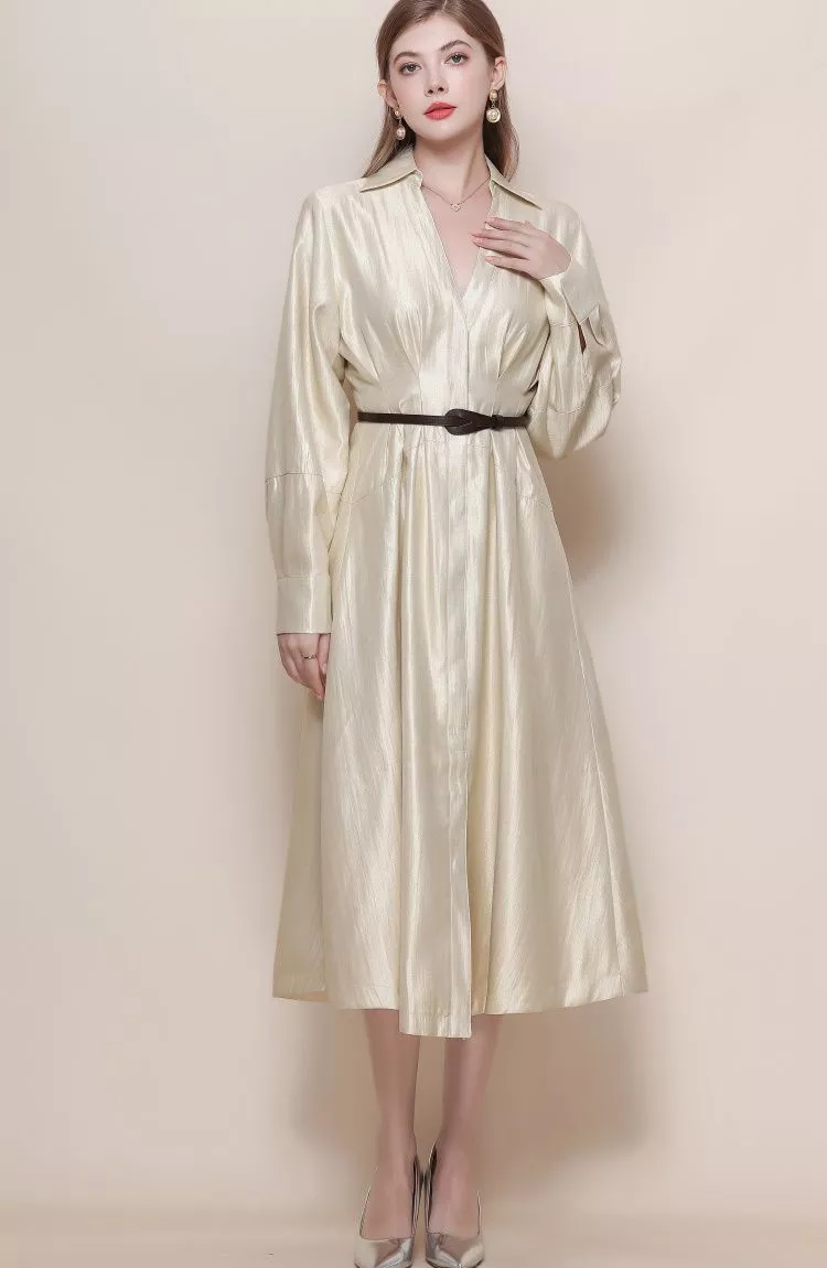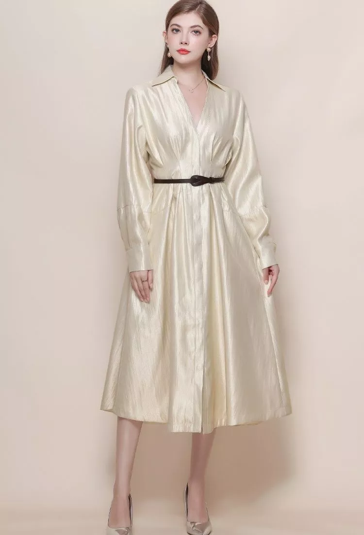 Vestito midi elegante in tonalità champagne, luminoso e raffinato, con scollo a V e maniche morbide che donano un’eleganza naturale. La cintura in vita crea un punto vita definito e valorizza la silhouette, mentre la gonna longuette cade fluida con un effetto leggero e femminile. Il look richiama lo stile francese contemporaneo, ideale per cerimonie, eventi, invitate e serate speciali in cui si vuole apparire sofisticate senza eccessi. Il materiale sintetico mantiene bene la struttura del capo e valorizza la brillantezza del colore.