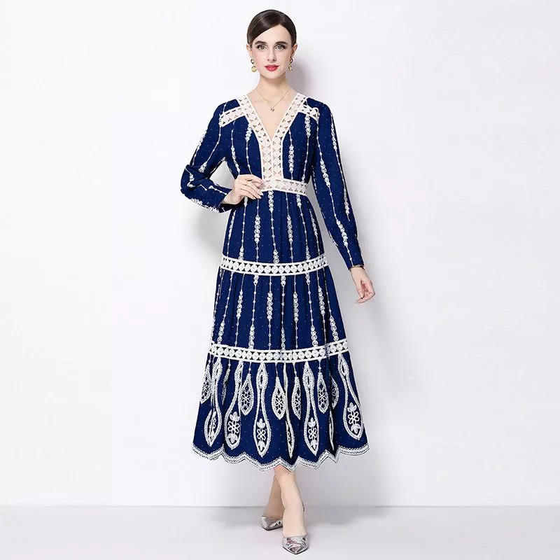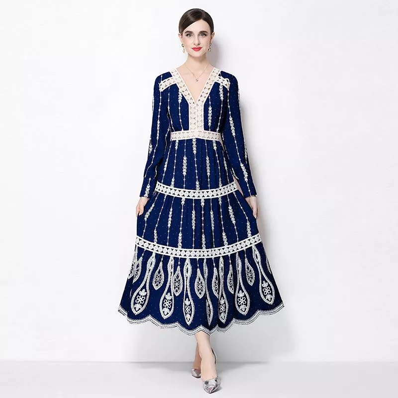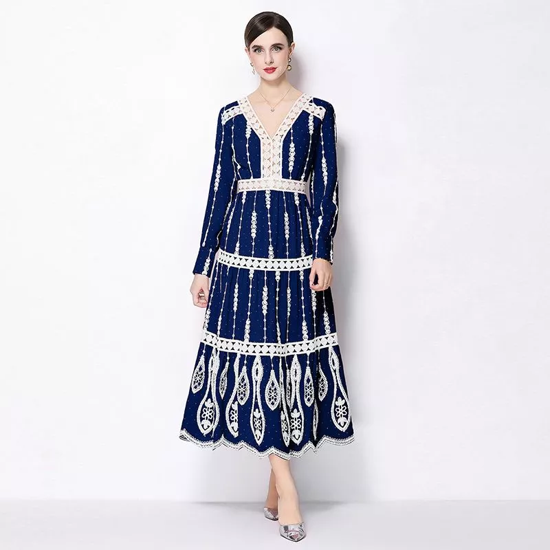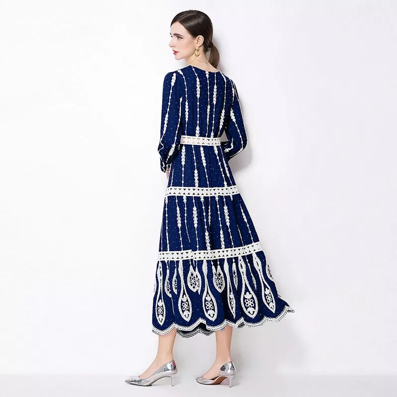 Vestito elegante da donna in raffinata tonalità blu navy con lavorazione in pizzo a contrasto avorio, ideale per occasioni speciali e cerimonie. Il design con scollo a V valorizza il décolleté, mentre la linea midi dona equilibrio tra eleganza e praticità. Le maniche lunghe e la struttura fluida creano un effetto femminile e sofisticato, perfetto per look curati e distintivi.
