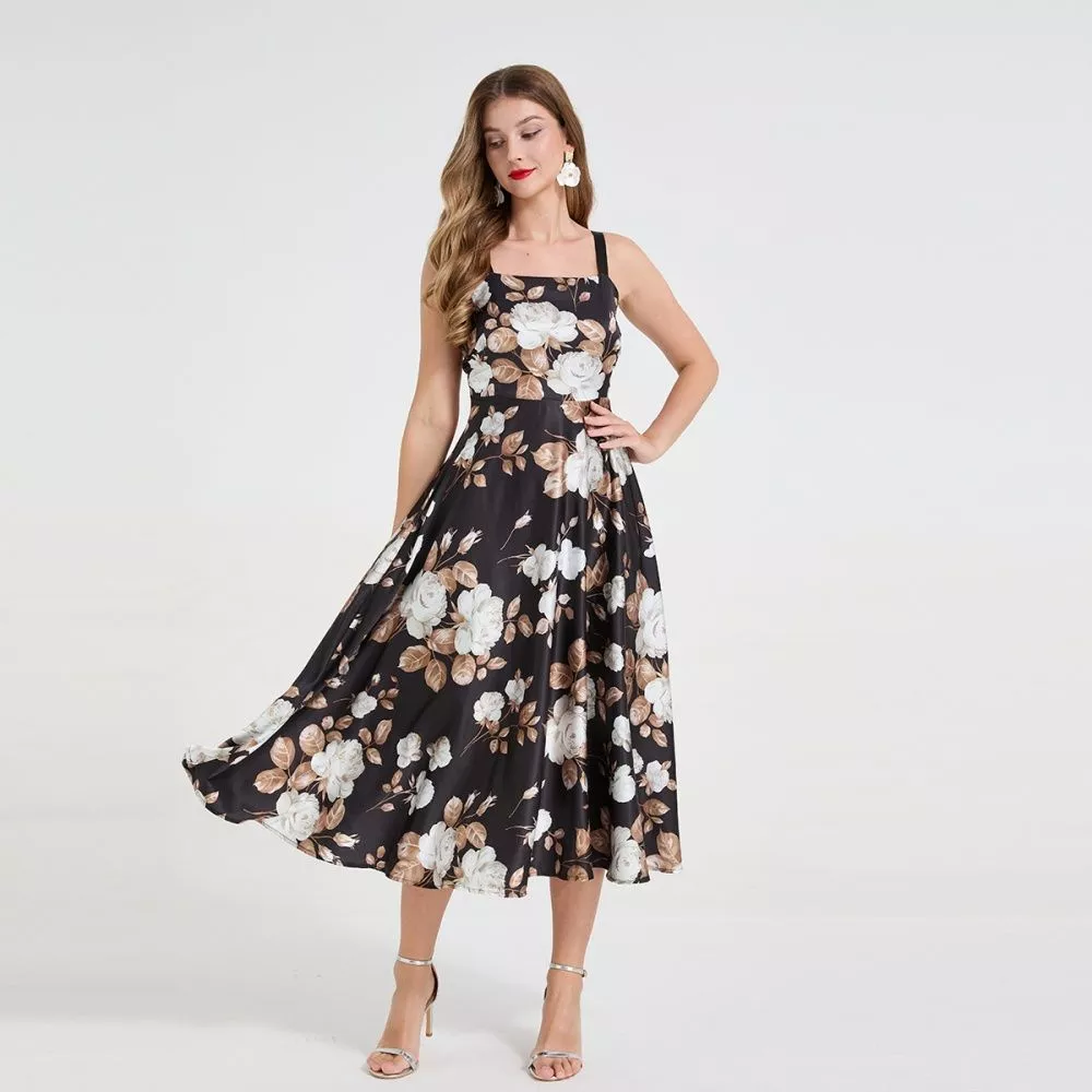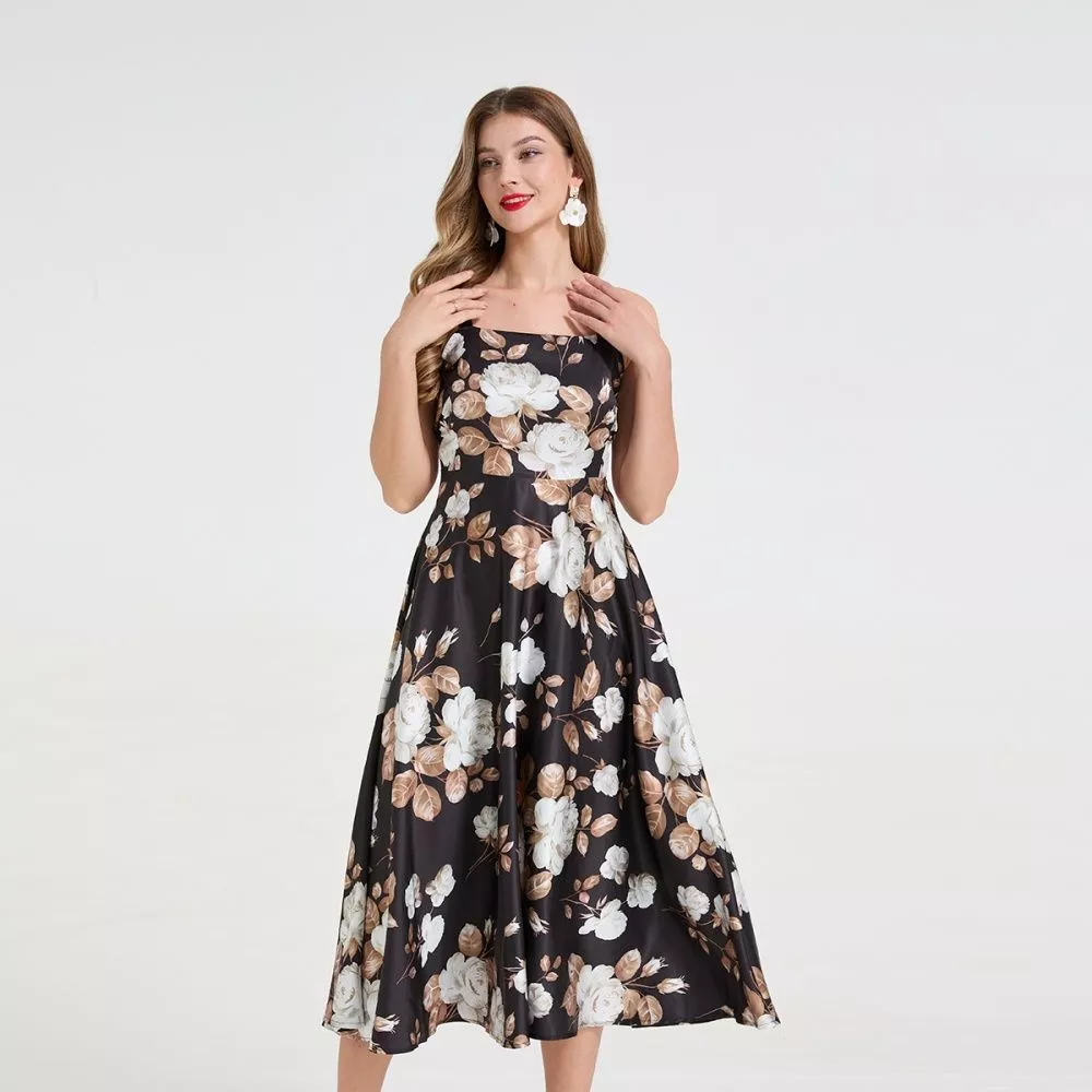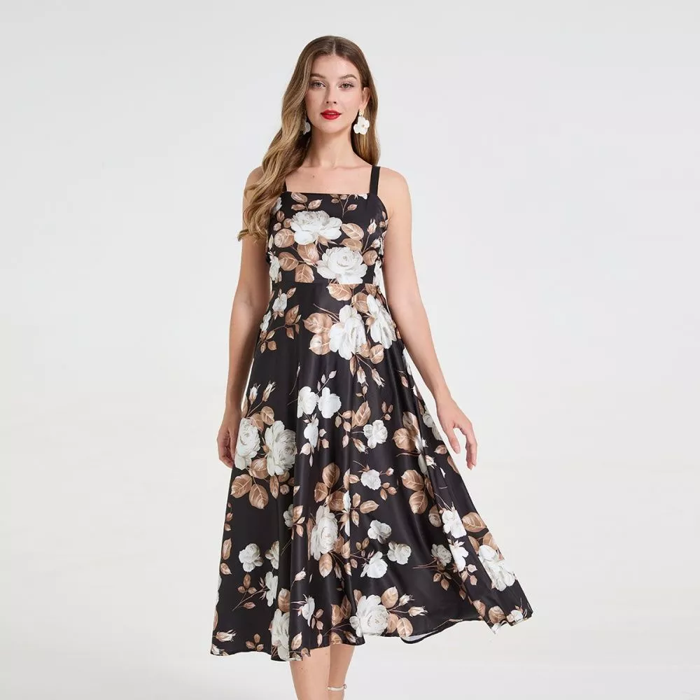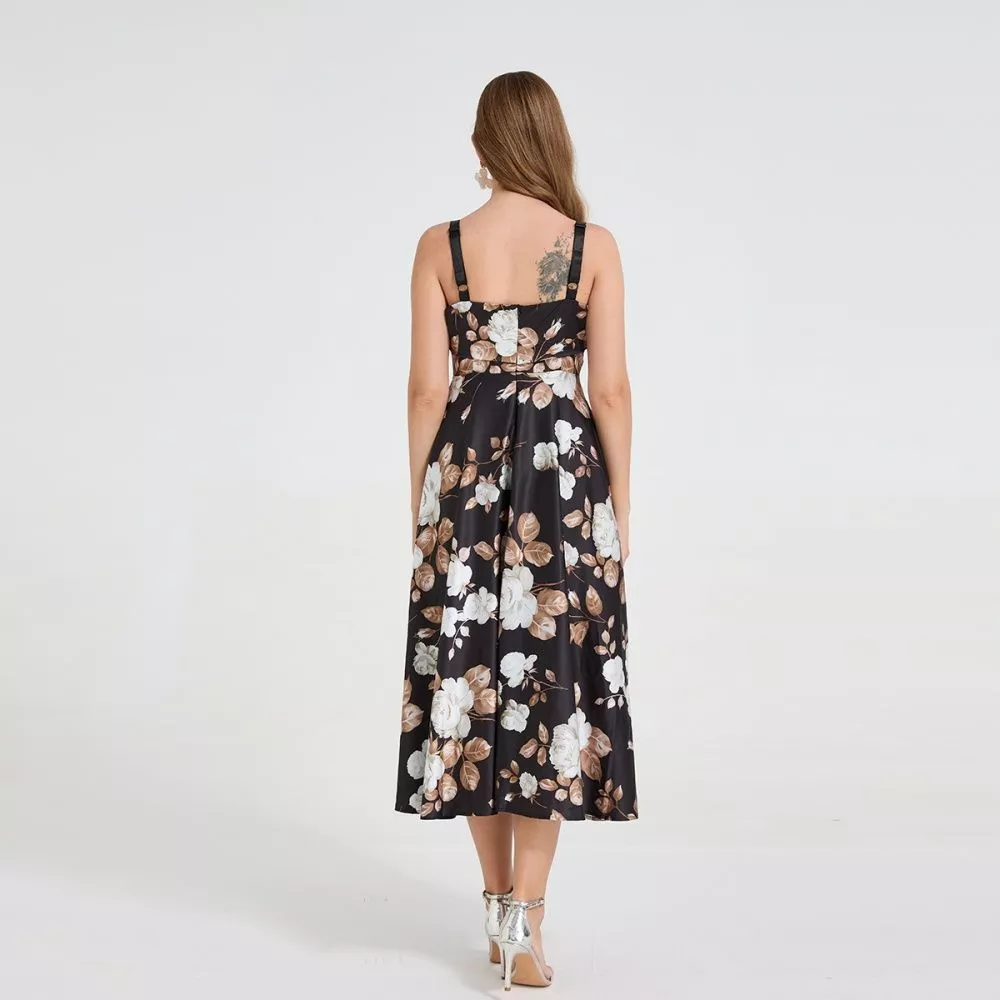 Vestito Midi Donna Elegante Floreale su Fondo Nero con Spalline Sottili CF58899