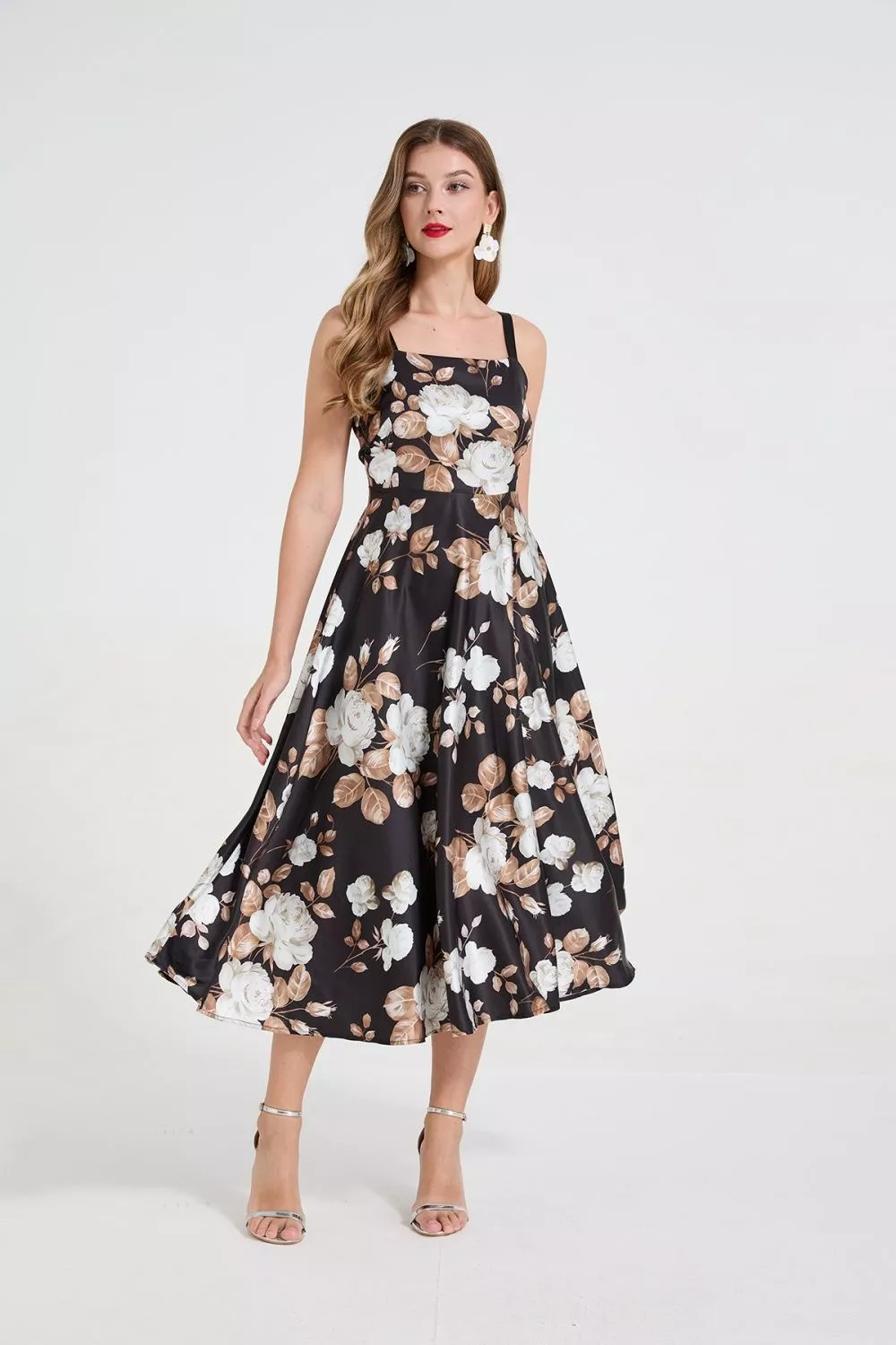 Vestito midi elegante con fantasia floreale nei toni del beige e dell’avorio su fondo nero, caratterizzato da un taglio femminile e moderno. Le spalline sottili valorizzano le spalle, mentre la gonna ampia e morbida crea un effetto fluido e armonioso ad ogni movimento. La stampa floreale dona luminosità e rende il capo ideale per eventi, cerimonie, invitate o look curati da giorno. Un modello raffinato, versatile e confortevole, grazie al tessuto sintetico morbido e leggero.