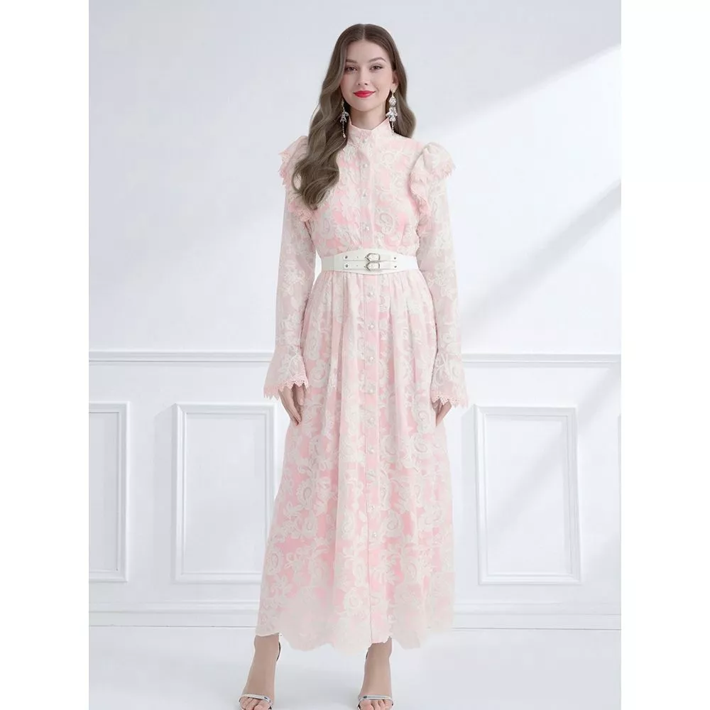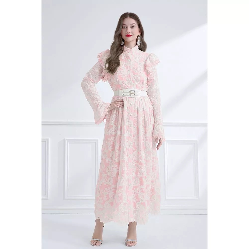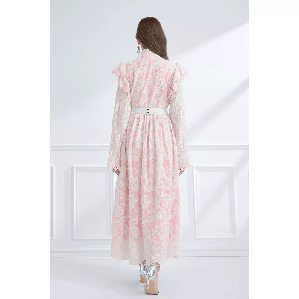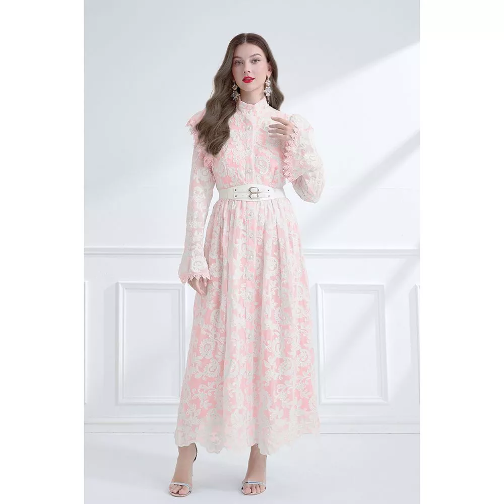 Vestito midi in pizzo dal gusto romantico ed elegante, proposto in una delicata tonalità rosa cipria con ricami floreali a contrasto. Il colletto alto dona un aspetto raffinato e ordinato, mentre il punto vita definito valorizza la silhouette in modo armonioso. Le maniche lunghe in pizzo e la gonna fluida sotto il ginocchio rendono questo vestito ideale per cerimonie, eventi eleganti e occasioni speciali in cui è richiesto uno stile femminile e curato.