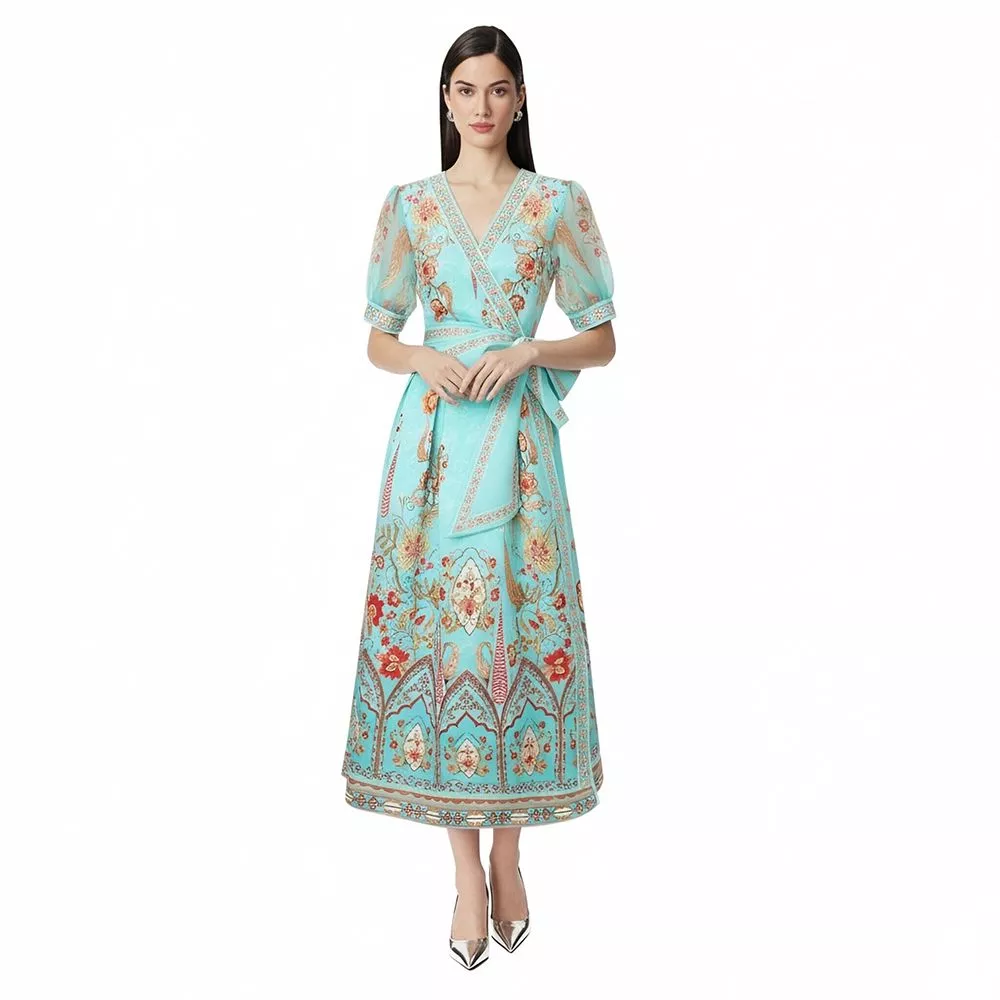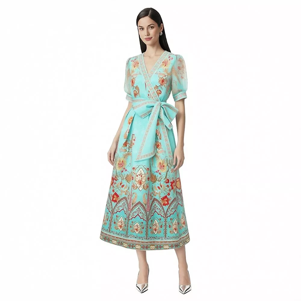 Vestito Midi Elegante Azzurro Tiffany Floreale Con Cintura Chic CF69393
