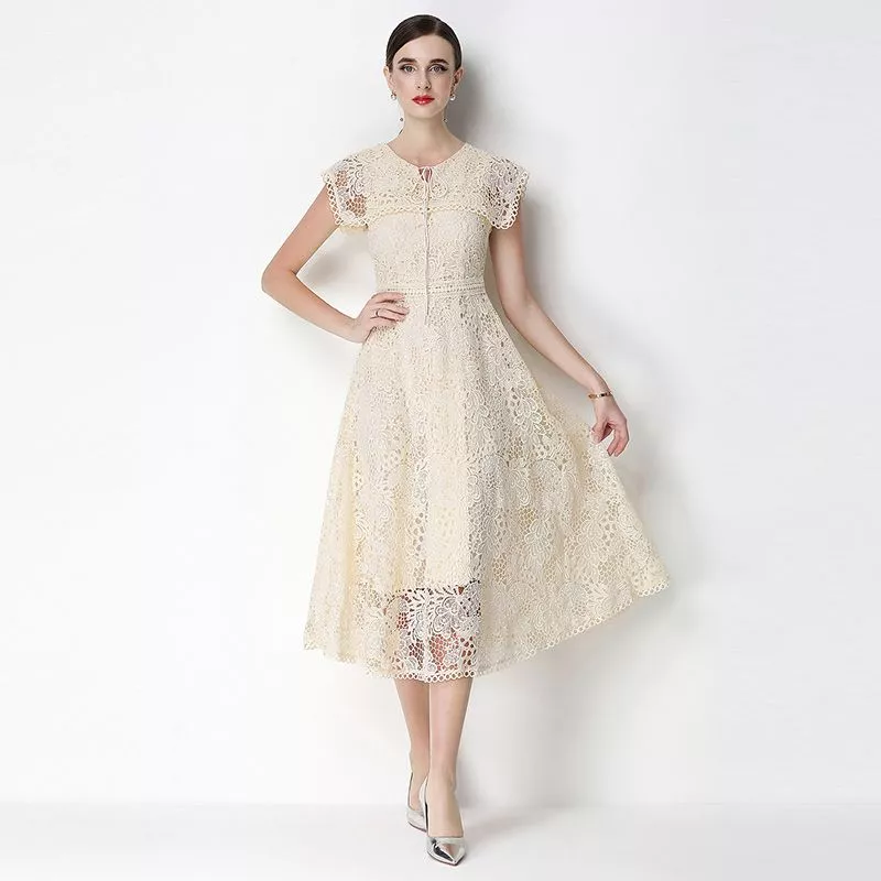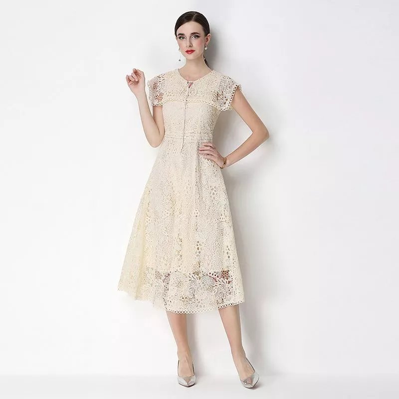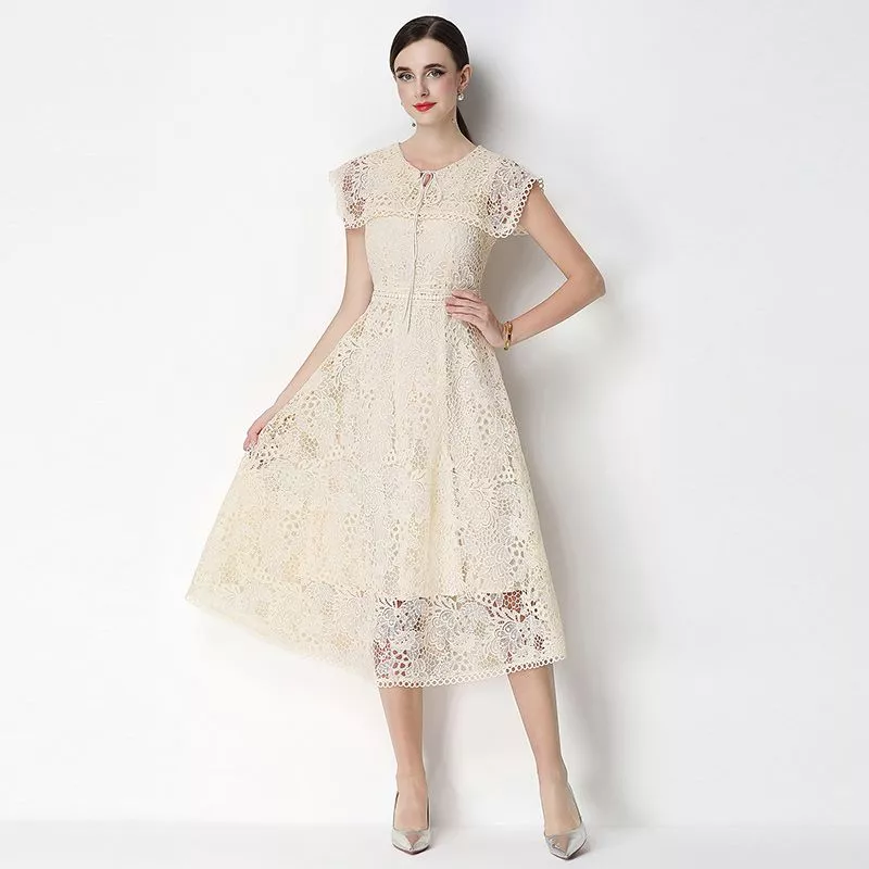 Vestito midi elegante realizzato in pizzo lavorato con motivo floreale, progettato per valorizzare la figura con una linea femminile e armoniosa.