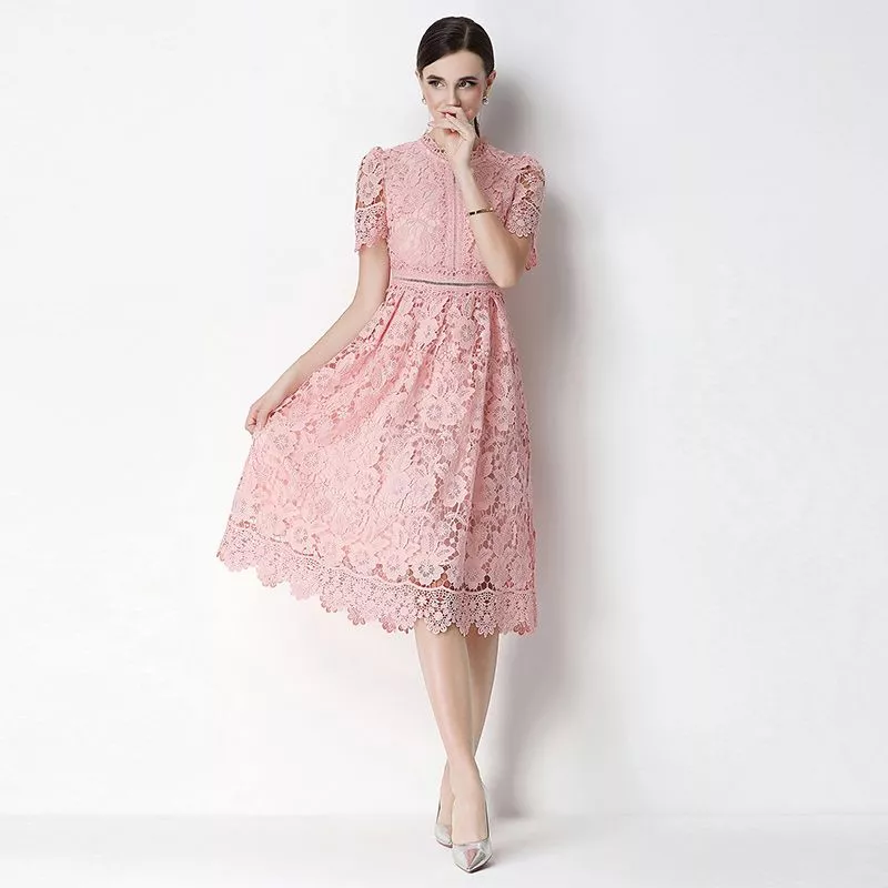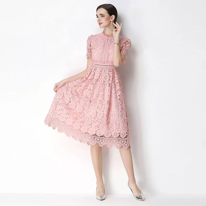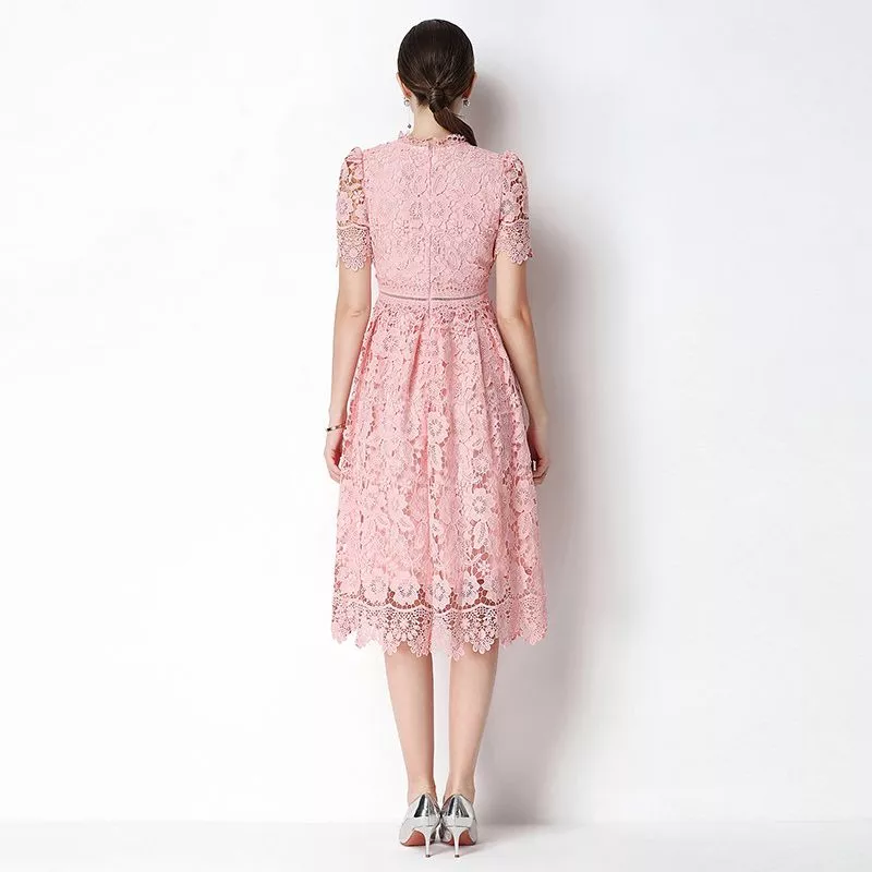 Vestito Midi Elegante Donna Pizzo Floreale Manica Corta Cerimonia Rosa CF70630