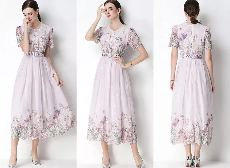 Vestito midi elegante caratterizzato da una stampa floreale delicata abbinata a dettagli ricamati che donano profondità e raffinatezza. Il design valorizza la silhouette grazie al punto vita definito e alla gonna ampia che scende morbida creando movimento.