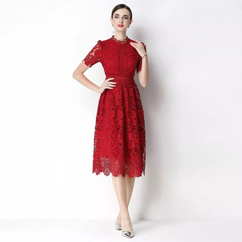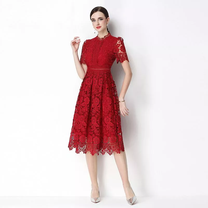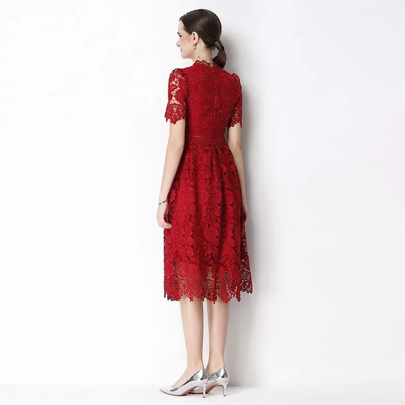 Vestito Midi Elegante in Pizzo Manica Corta per Cerimonia e Eventi Rosso CF70627