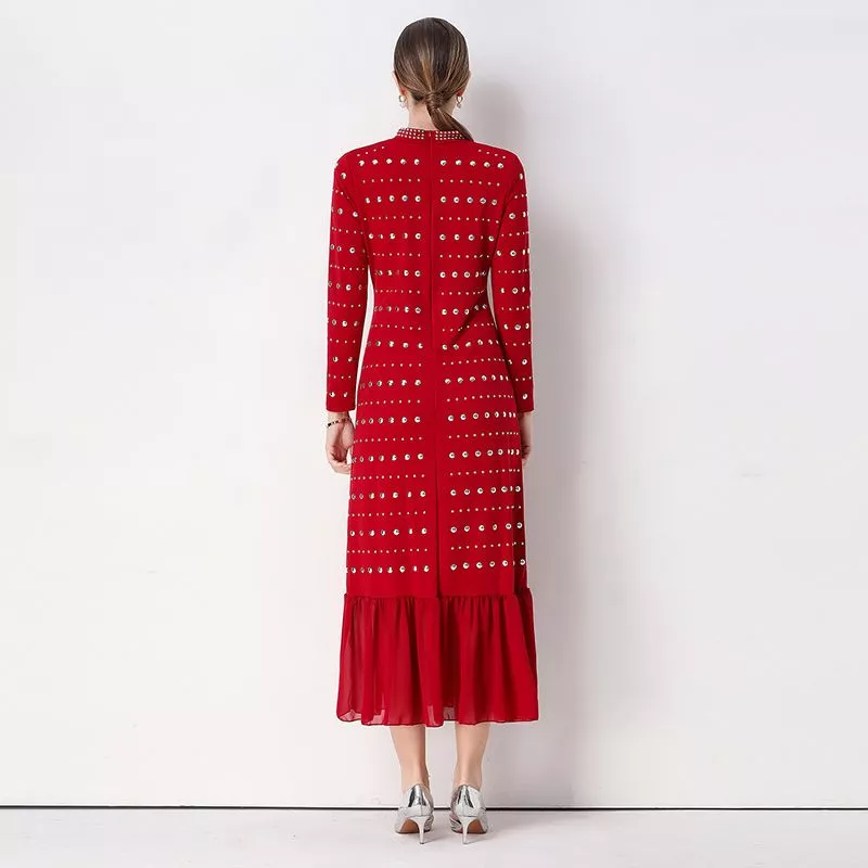 Vestito Midi Elegante Rosso Aderente Borchie Maniche Lunghe CF69313