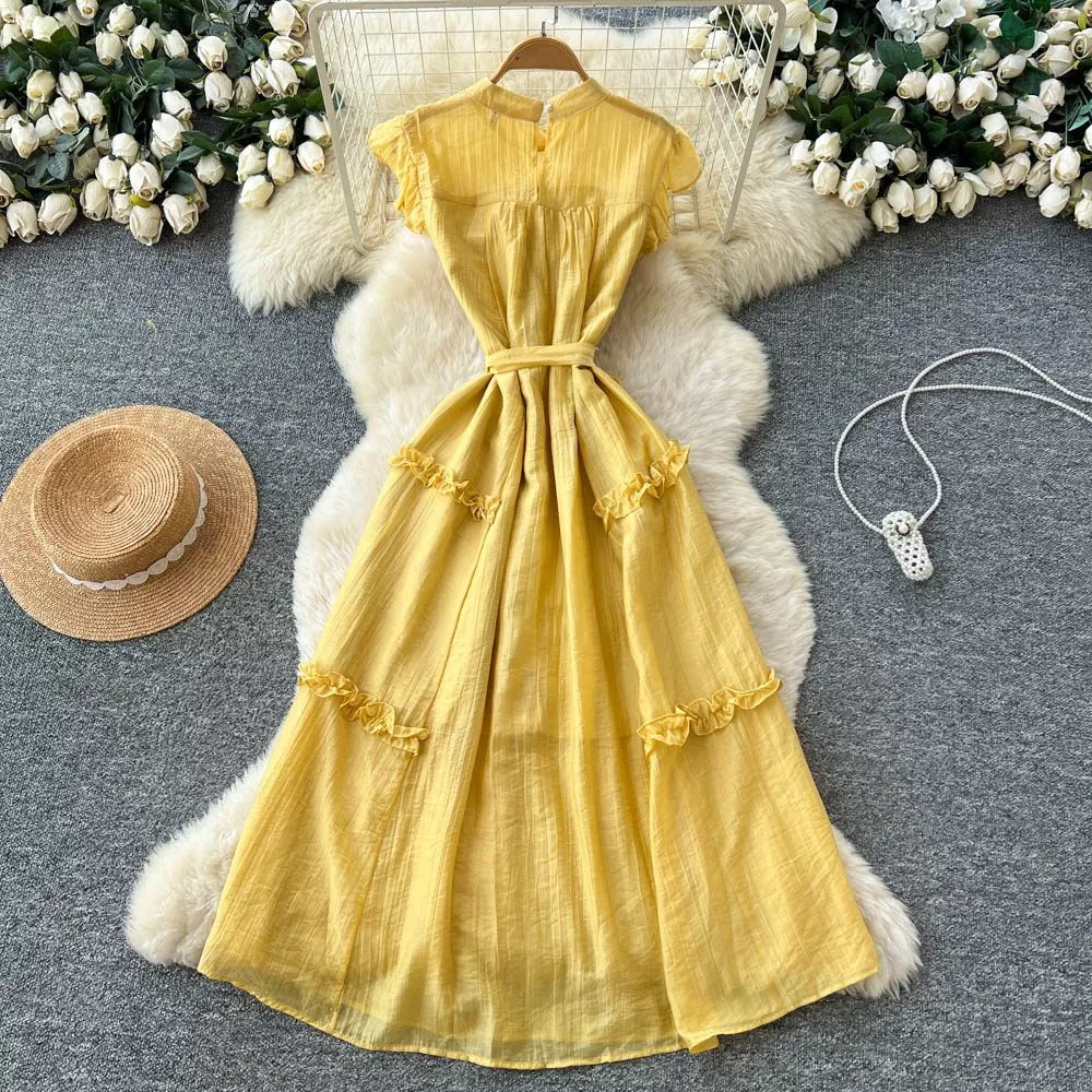 Vestito midi dalla linea morbida e femminile, perfetto per un look romantico e raffinato. Il design in stile bon ton è valorizzato dalla cintura in vita che definisce la silhouette con naturalezza, mentre le maniche corte con volant aggiungono movimento e leggerezza.