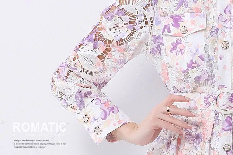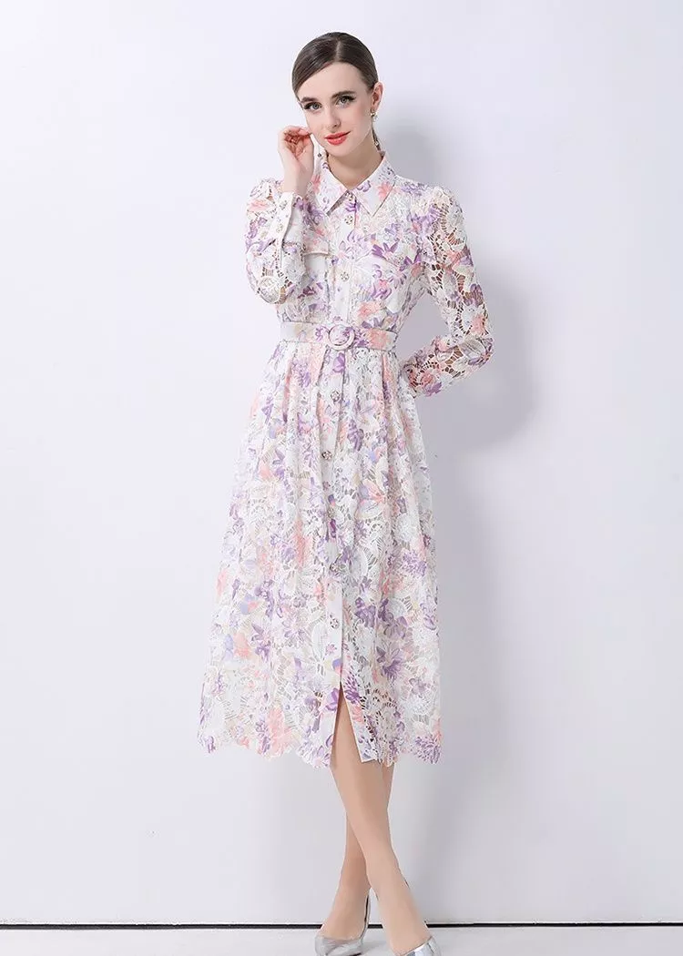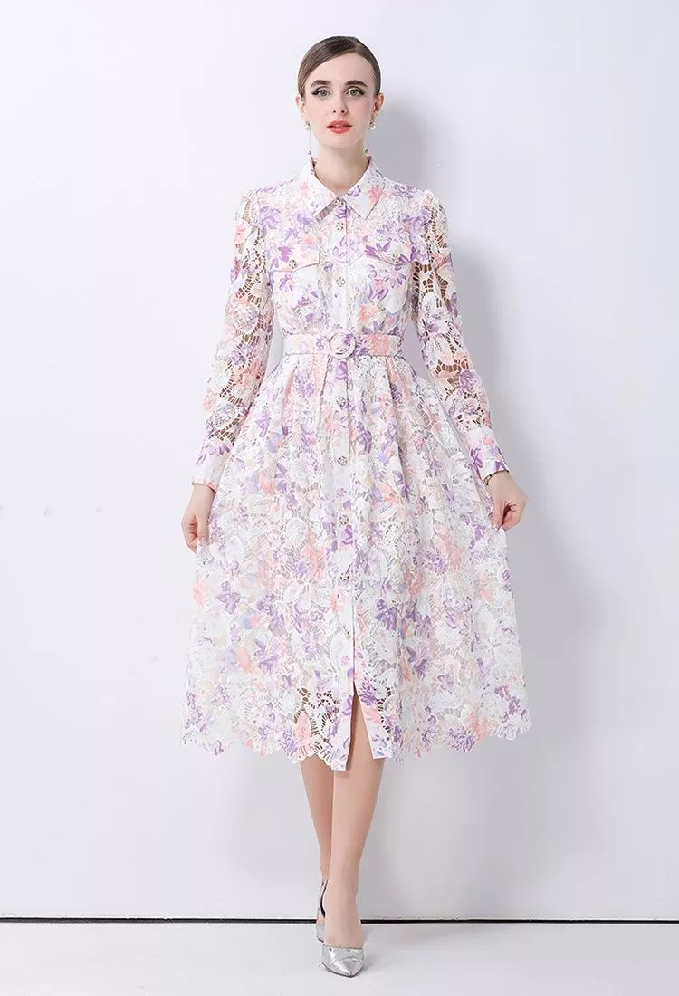Vestito Midi Ricamato Elegante Floreale Maniche Lunghe Cintura Viola CF58593