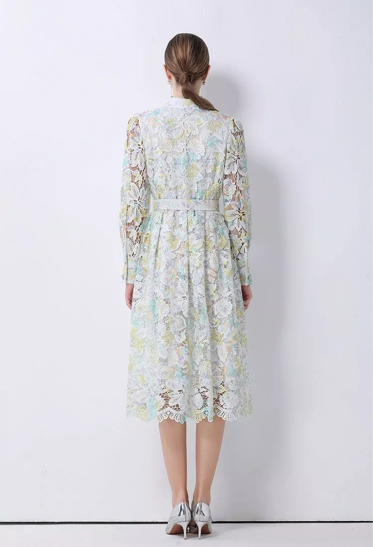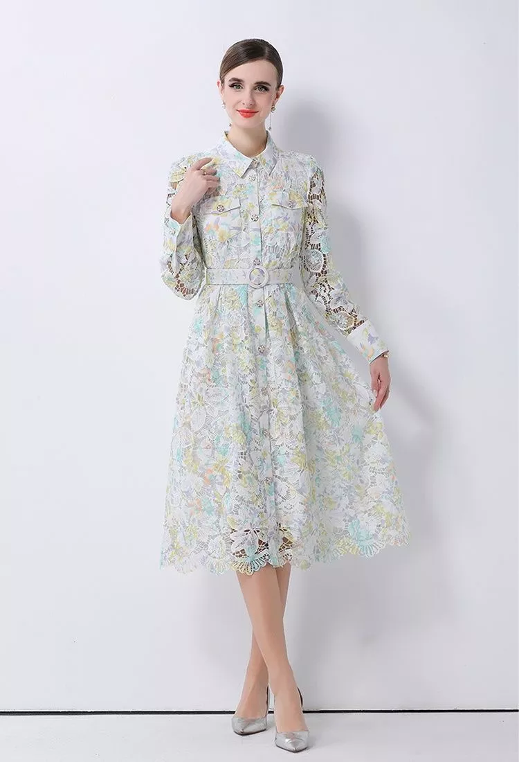 Un vestito midi ricamato dal carattere elegante e romantico, pensato per valorizzare la femminilità con delicatezza. La lavorazione floreale ricca di dettagli crea un effetto tridimensionale luminoso, mentre le maniche lunghe traforate donano un tocco sofisticato senza appesantire la linea. La cintura in vita definisce la silhouette e armonizza le proporzioni, rendendo il modello ideale per cerimonie, eventi e momenti in cui serve un look curato e raffinato. Il tessuto sintetico assicura comfort e una buona tenuta della forma, mantenendo un'estetica ordinata e preziosa. Le varianti colore pastello esaltano l'eleganza dell'abito con una luminosità discreta e delicata.