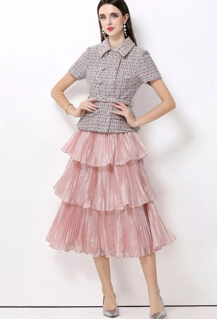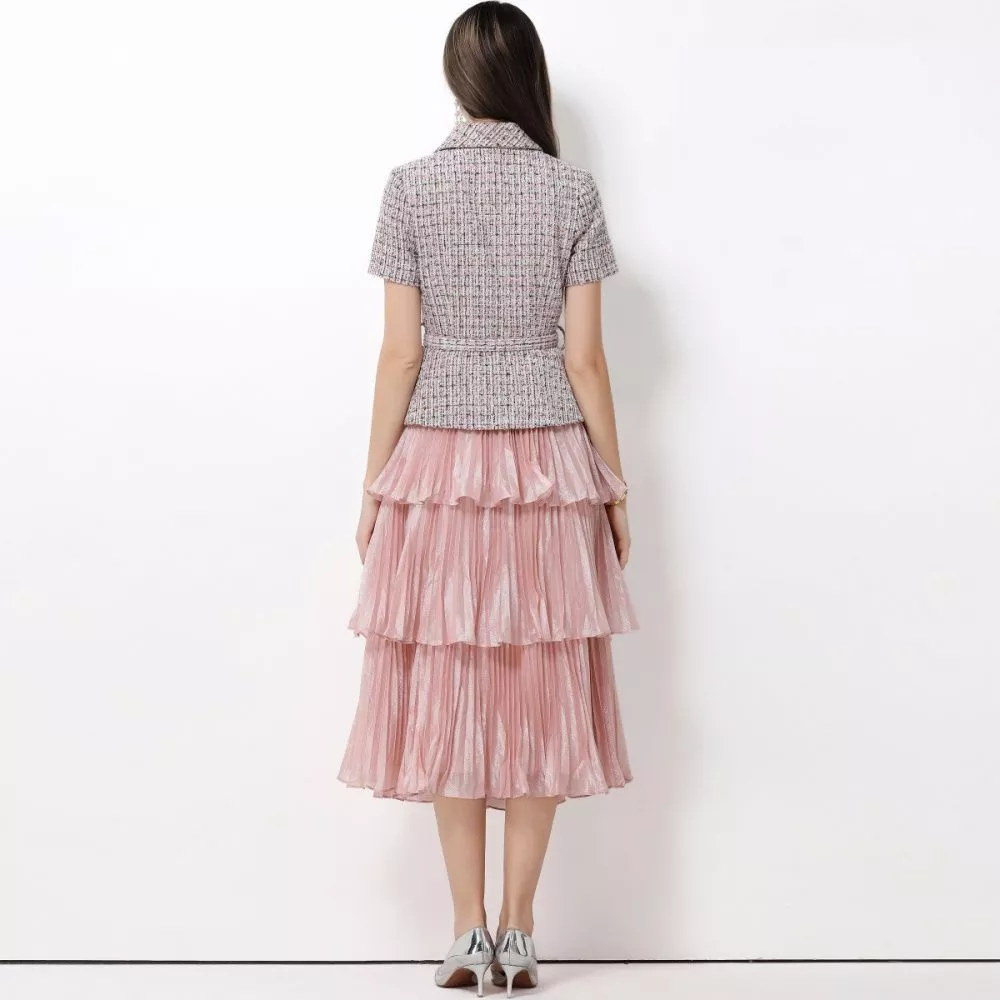 Vestito midi dal gusto elegante e femminile, caratterizzato da un raffinato contrasto tra la parte superiore strutturata e la gonna a balze morbide e leggere. Il corpino presenta una linea ispirata alla giacca, con colletto definito, maniche corte e cintura coordinata che valorizza il punto vita. La gonna stratificata dona movimento e leggerezza all’insieme, rendendo questo modello ideale per cerimonie, eventi diurni e occasioni speciali dallo stile ricercato.