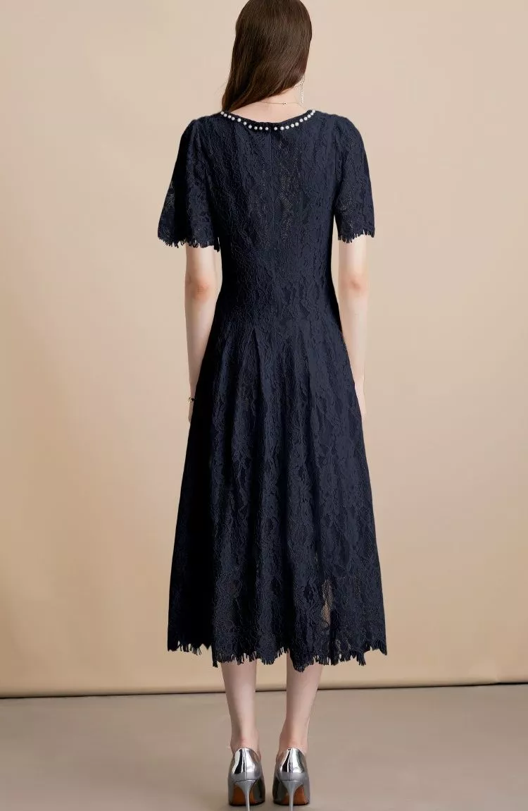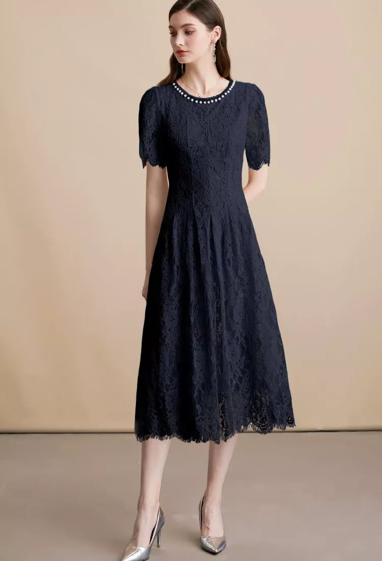 Un vestito midi in pizzo nero dal fascino intramontabile, ideale per eventi serali, cerimonie e occasioni formali. Il girocollo arricchito da perle e dettagli luminosi esalta lo stile raffinato, mentre le maniche corte in pizzo trasparente donano leggerezza. Il taglio leggermente svasato valorizza la figura con eleganza discreta. Un capo versatile e sofisticato, perfetto per sentirsi impeccabili in ogni occasione speciale.