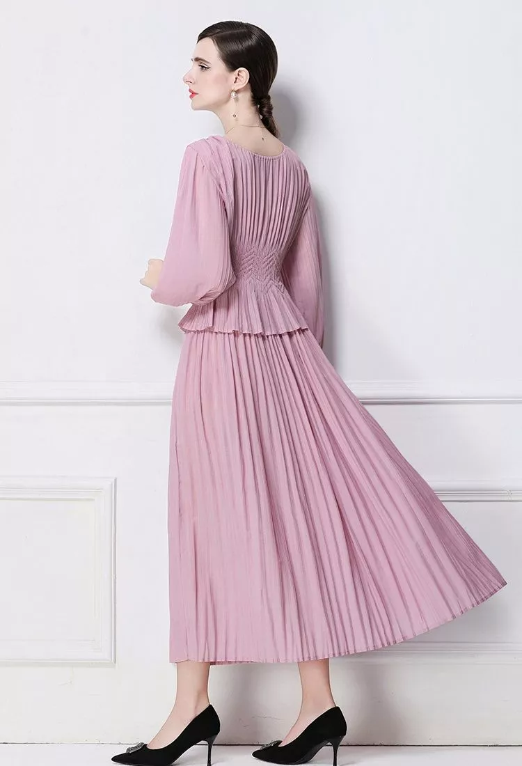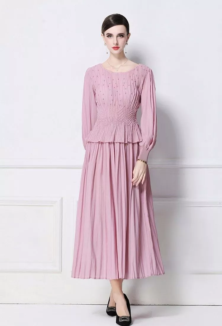 Questo vestito plissé con perline sulla parte superiore unisce eleganza e stile romantico, perfetto per cerimonie e invitate. Il corpino arricciato slancia la figura, mentre la gonna plissé aggiunge movimento fluido e raffinato. Le maniche lunghe completano un look femminile e ricercato, disponibile in tonalità moderne che valorizzano ogni incarnato.