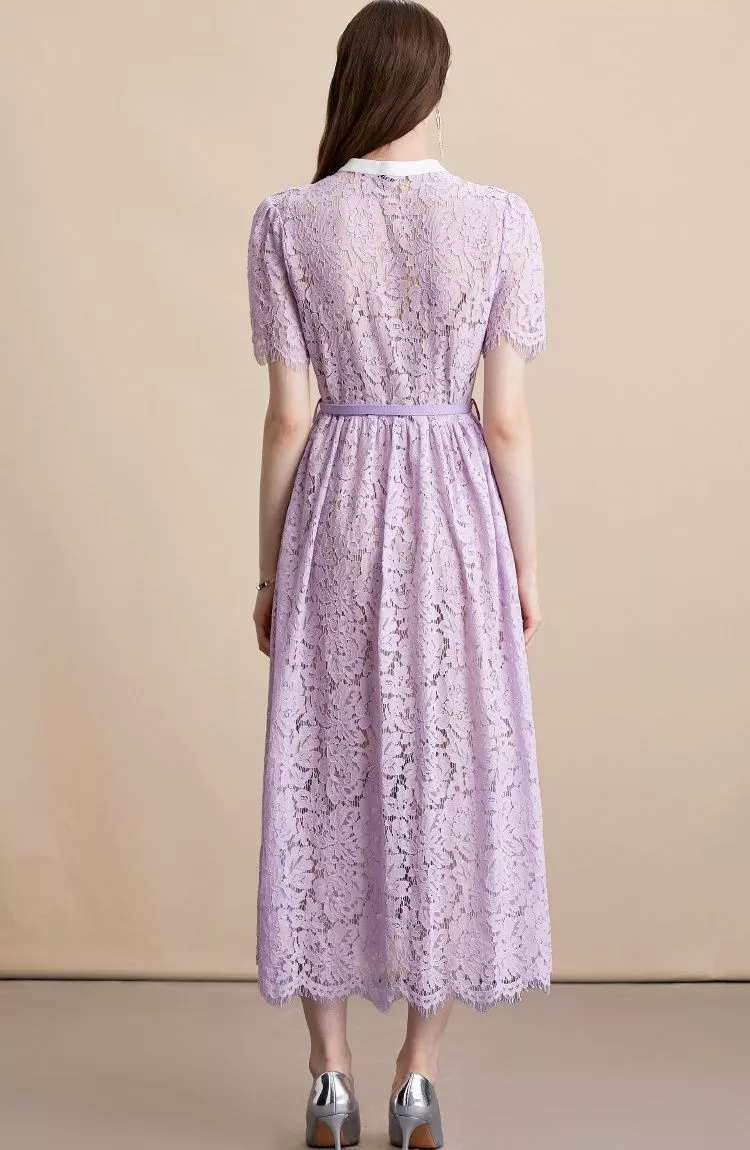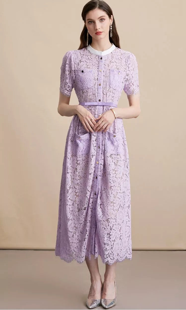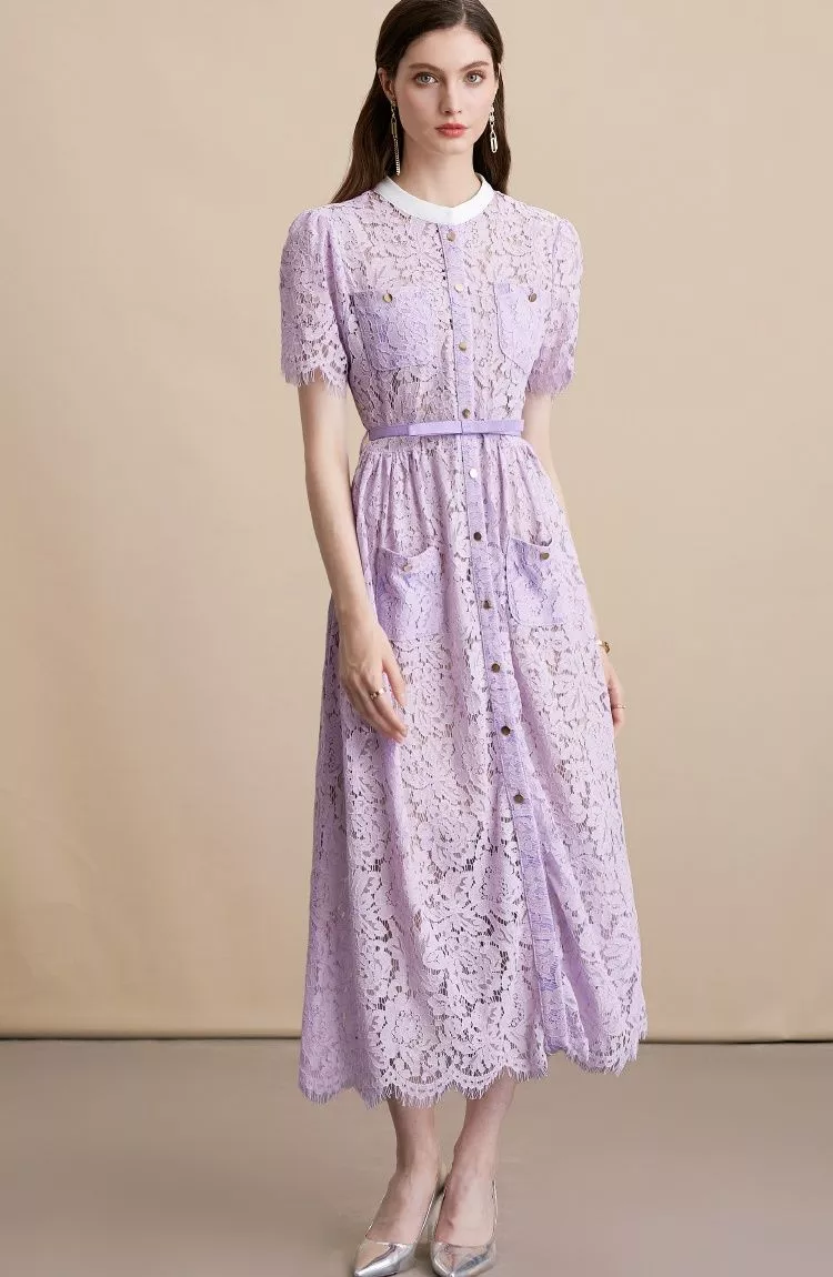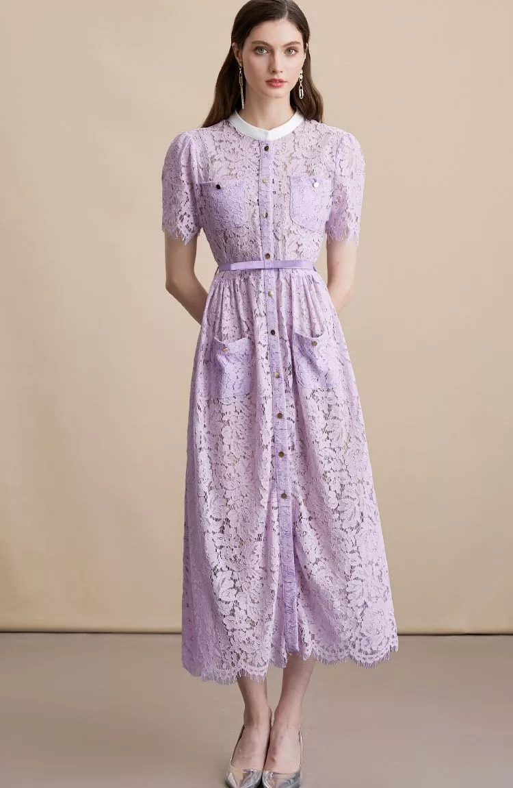 Romantico e raffinato, questo vestito midi porpora in pizzo con maniche corte è la scelta perfetta per cerimonie ed eventi estivi. La lavorazione traforata valorizza la femminilità con eleganza, mentre i bottoncini frontali e la cintura in vita completano il look definendo la silhouette. Un capo versatile e sofisticato che unisce romanticismo e modernità, ideale per distinguersi in ogni occasione speciale.