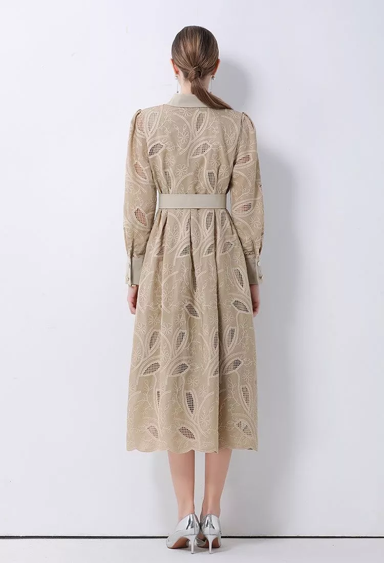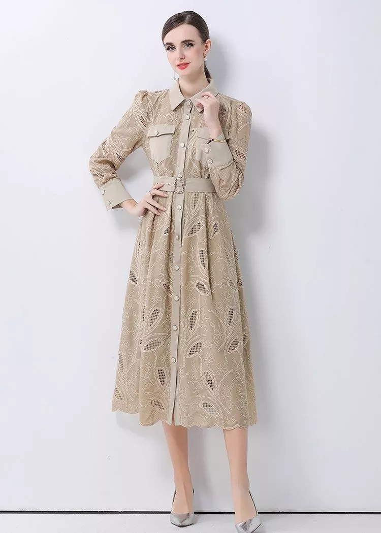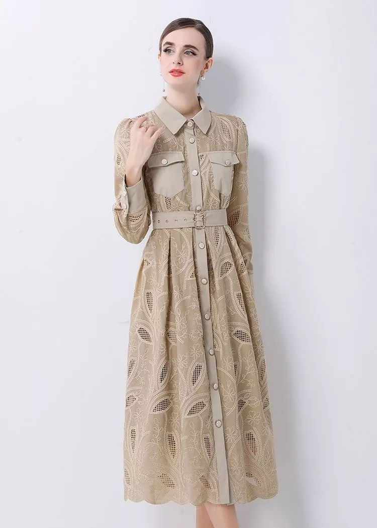 Vestito Ricamato Midi Elegante Maniche Lunghe Cintura Cachi Chiaro Donna CF58591