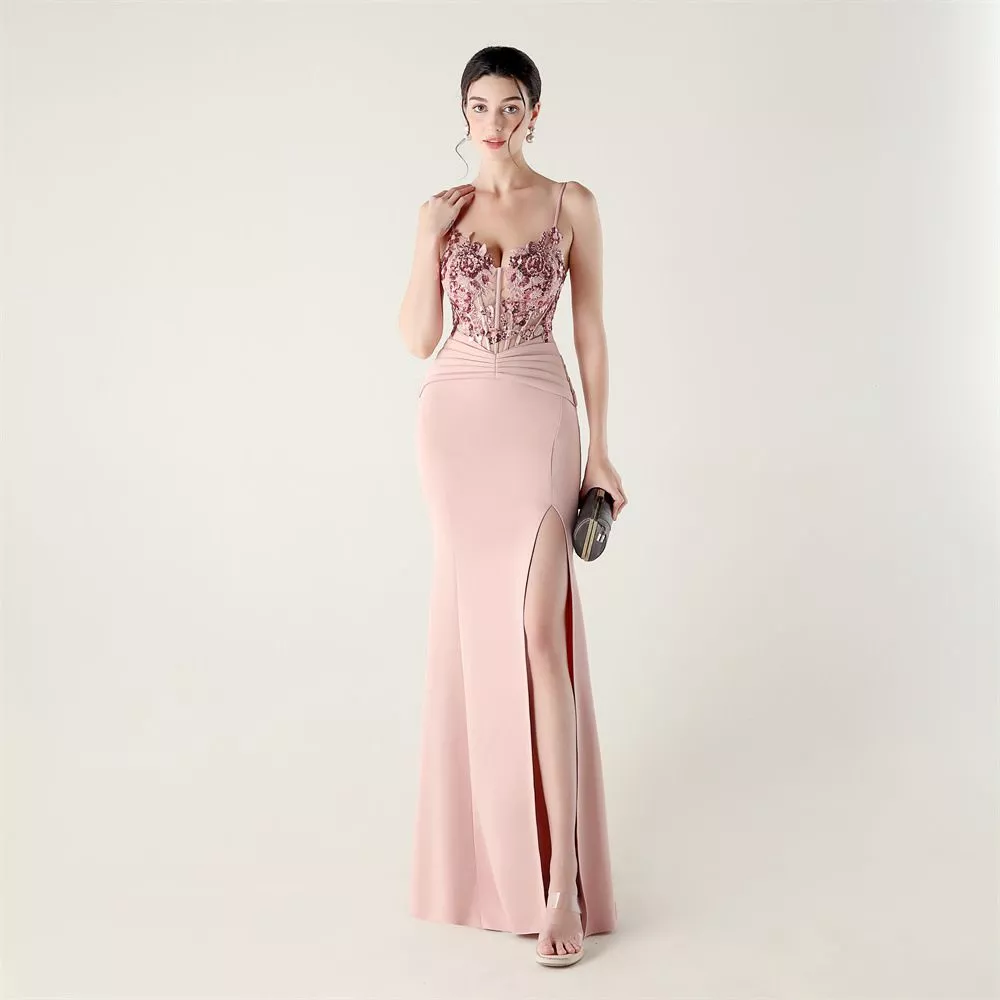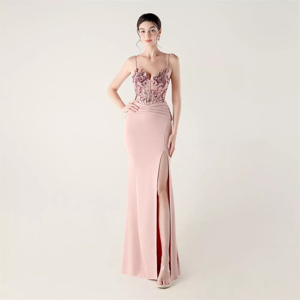 Vestito Rosa Cipria Con Corsetto Ricamato Elegante Da Cerimonia CF50202