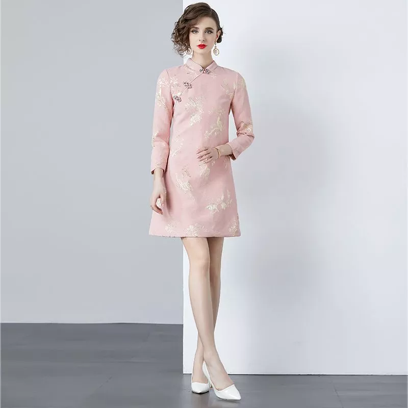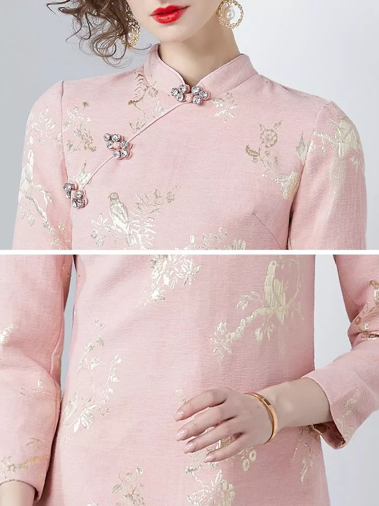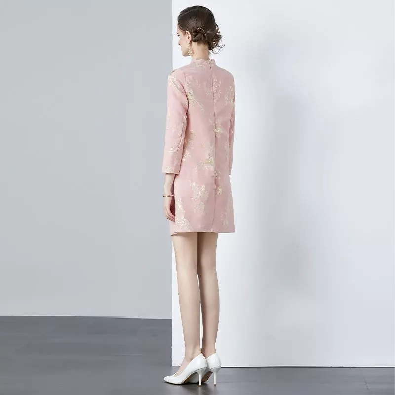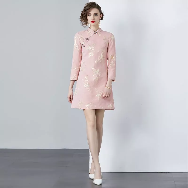 Vestito Rosa Con Ricami Oro Maniche Lunghe Elegante E Raffinato CF56899