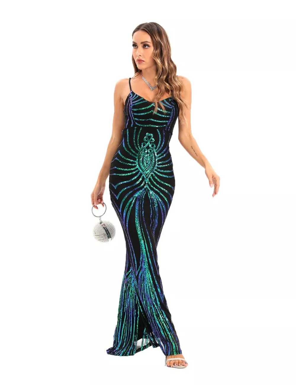 Un vestito lungo dal fascino scenografico, pensato per mettere in risalto la figura con eleganza e carattere. Le paillettes creano un disegno luminoso che slancia la silhouette e dona un effetto sofisticato ideale per serate importanti, feste, cerimonie e contesti speciali. La linea aderente valorizza le forme senza rinunciare al comfort, mentre la scollatura morbida con spalline sottili aggiunge una nota sensuale e raffinata. Un modello che cattura lo sguardo e garantisce un’entrata indimenticabile in ogni occasione.