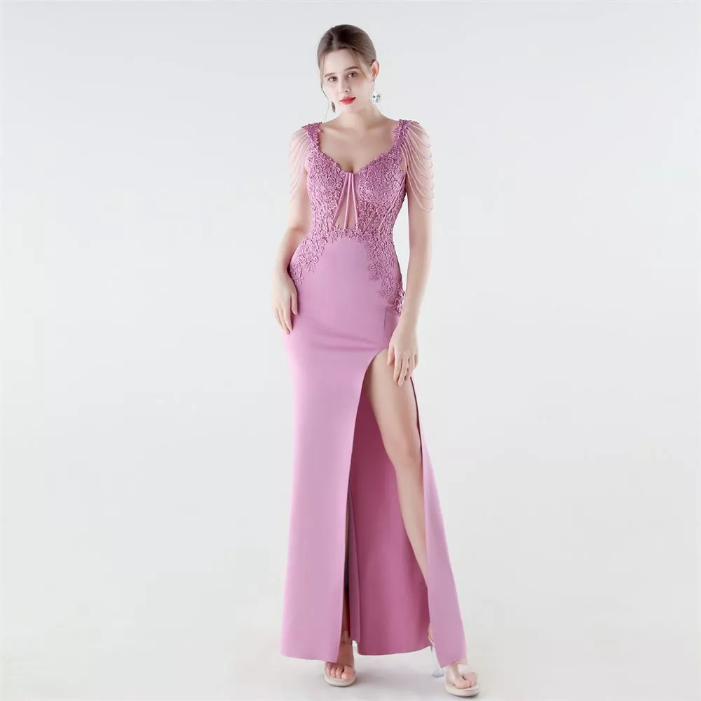 Vestito Sera Lungo Con Pizzo Ricamato E Spacco Rosa Scuro Sirena CF61174