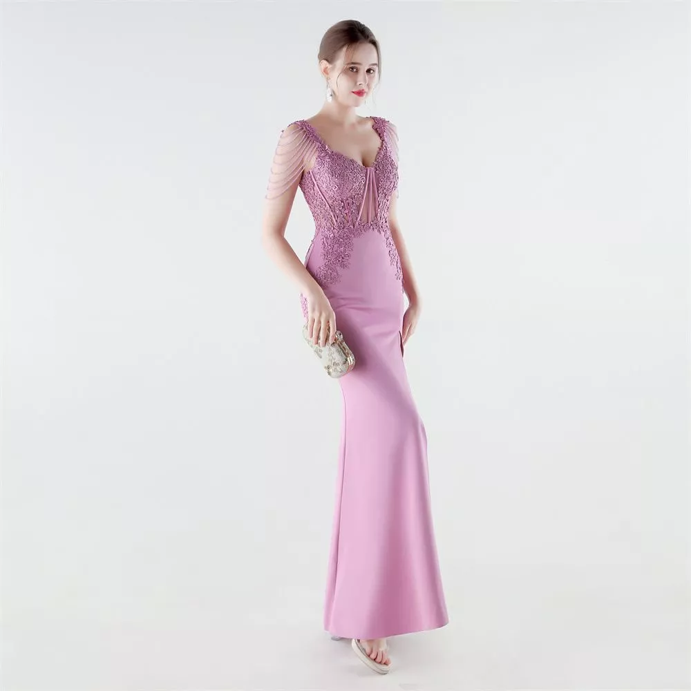 Un vestito da sera elegante e scenografico, pensato per valorizzare la silhouette con una linea lunga e fluida. Il corpetto ricamato con applicazioni in pizzo crea un effetto raffinato che illumina il décolleté, mentre le spalline decorate aggiungono un tocco esclusivo e moderno.
