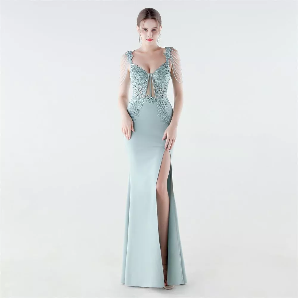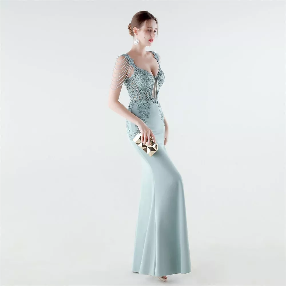 Un vestito da sera elegante e scenografico, pensato per valorizzare la silhouette con una linea lunga e fluida. Il corpetto ricamato con applicazioni in pizzo crea un effetto raffinato che illumina il décolleté, mentre le spalline decorate aggiungono un tocco esclusivo e moderno.