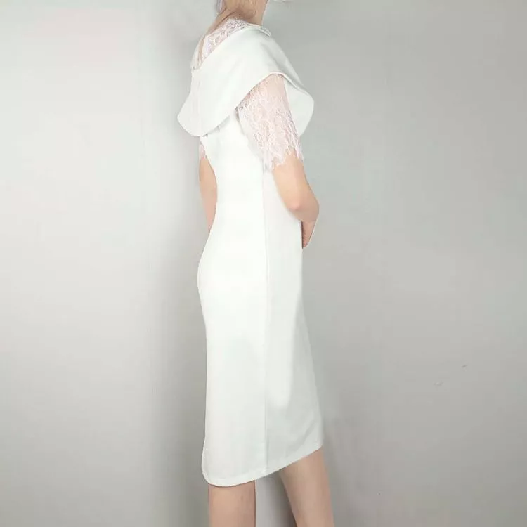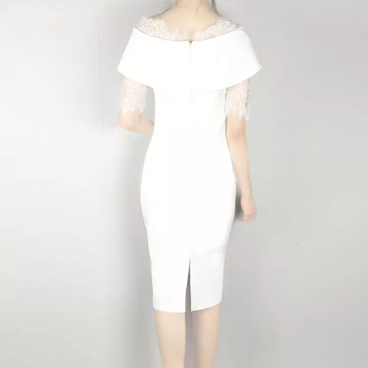 Vestito Tubino Elegante Bianco Pizzo Scollo Bardot Cerimonia Midi CF69611