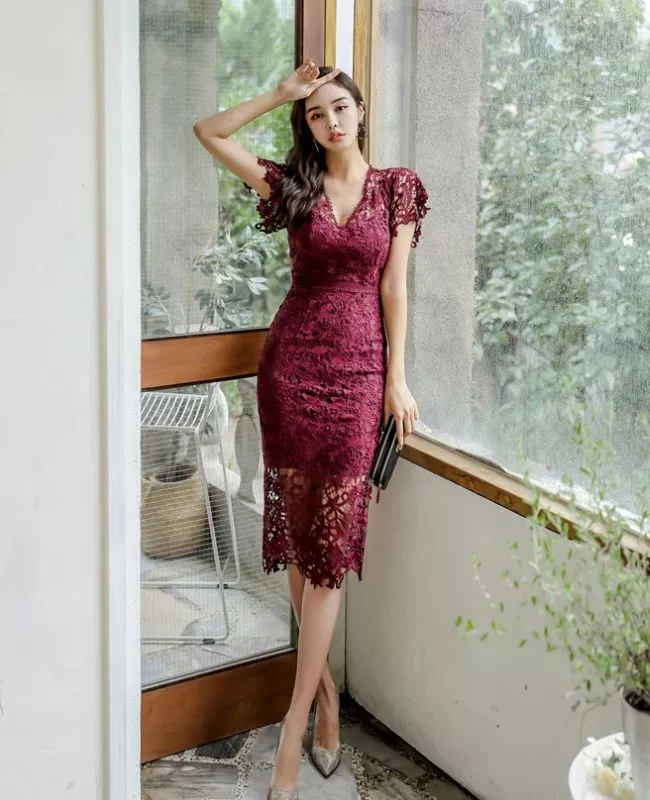 Vestito Tubino Elegante In Pizzo Rosso Vino Scollo V Slim Fit Sera CF69615