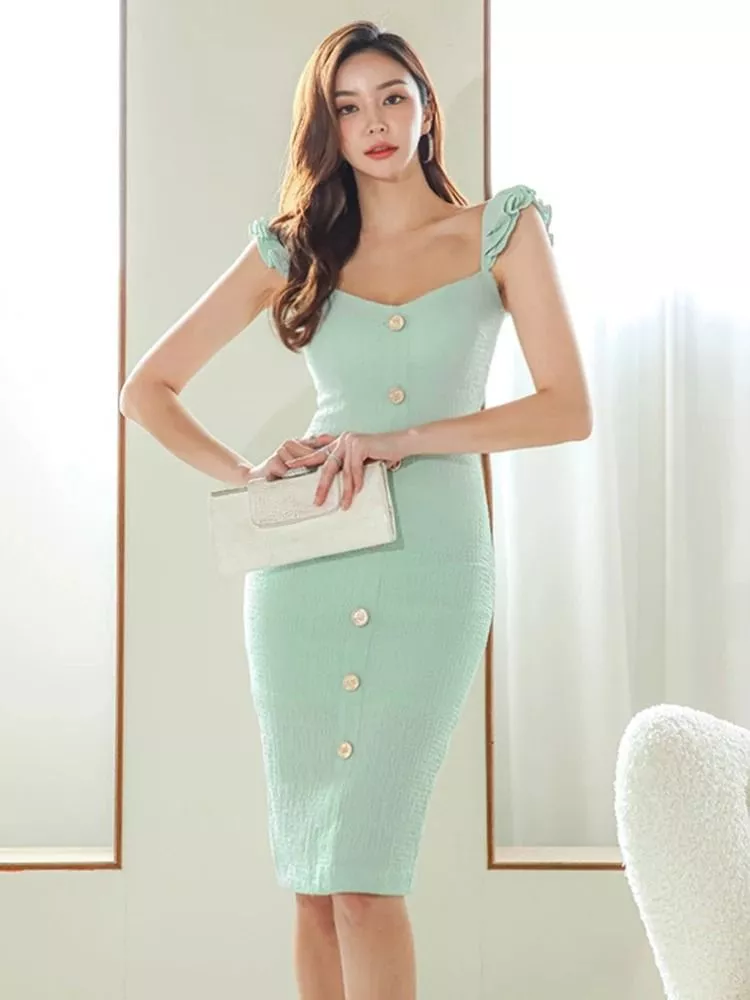 Vestito tubino midi dalla linea femminile e raffinata, valorizzato da silhouette aderente, bottoni frontali decorativi e spalline con delicato dettaglio volant. Il design slancia la figura e crea un look elegante e ricercato, ideale per cerimonie, eventi o occasioni speciali. Il colore verde acqua dona luminosità e rende il modello estremamente attuale.