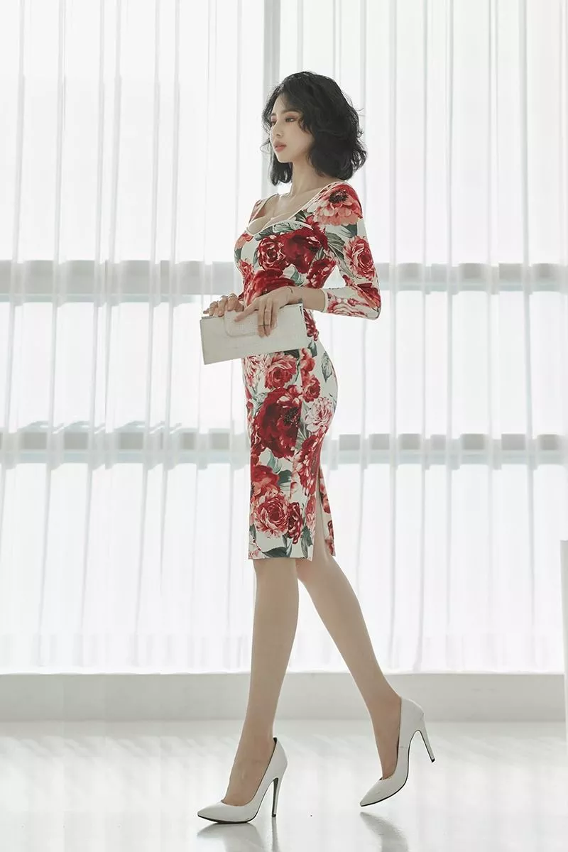 Tubino midi dal taglio femminile e modellante con stampa floreale scenografica sui toni rosso vino e avorio. La linea aderente valorizza la silhouette, mentre lo scollo morbido e la fantasia botanica rendono il modello sofisticato e molto ricercato, ideale per eventi, cerimonie e occasioni eleganti.